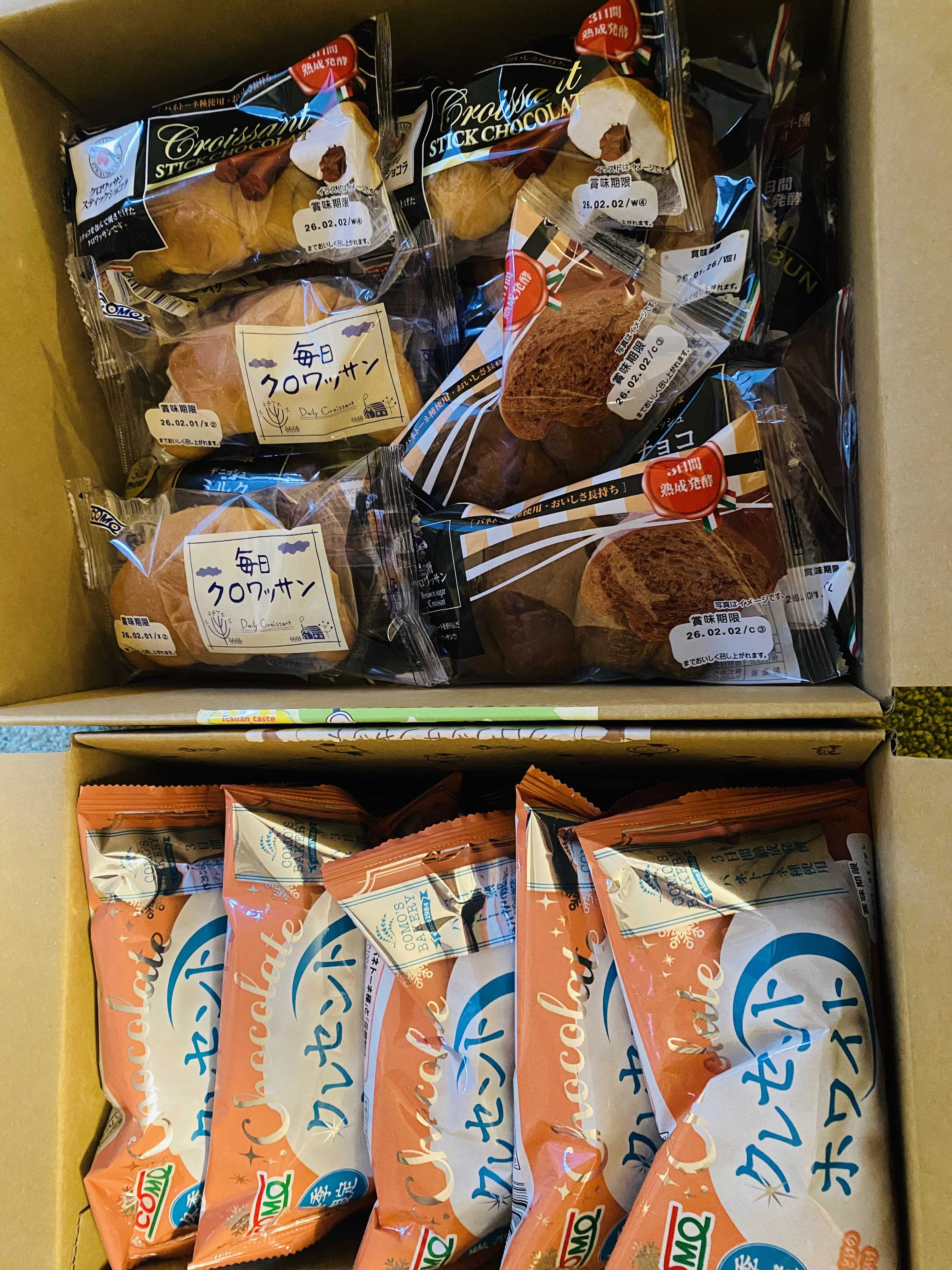コモパン到着しました。上がおためしセットで下が2種のチョコクロワッサンセットです…