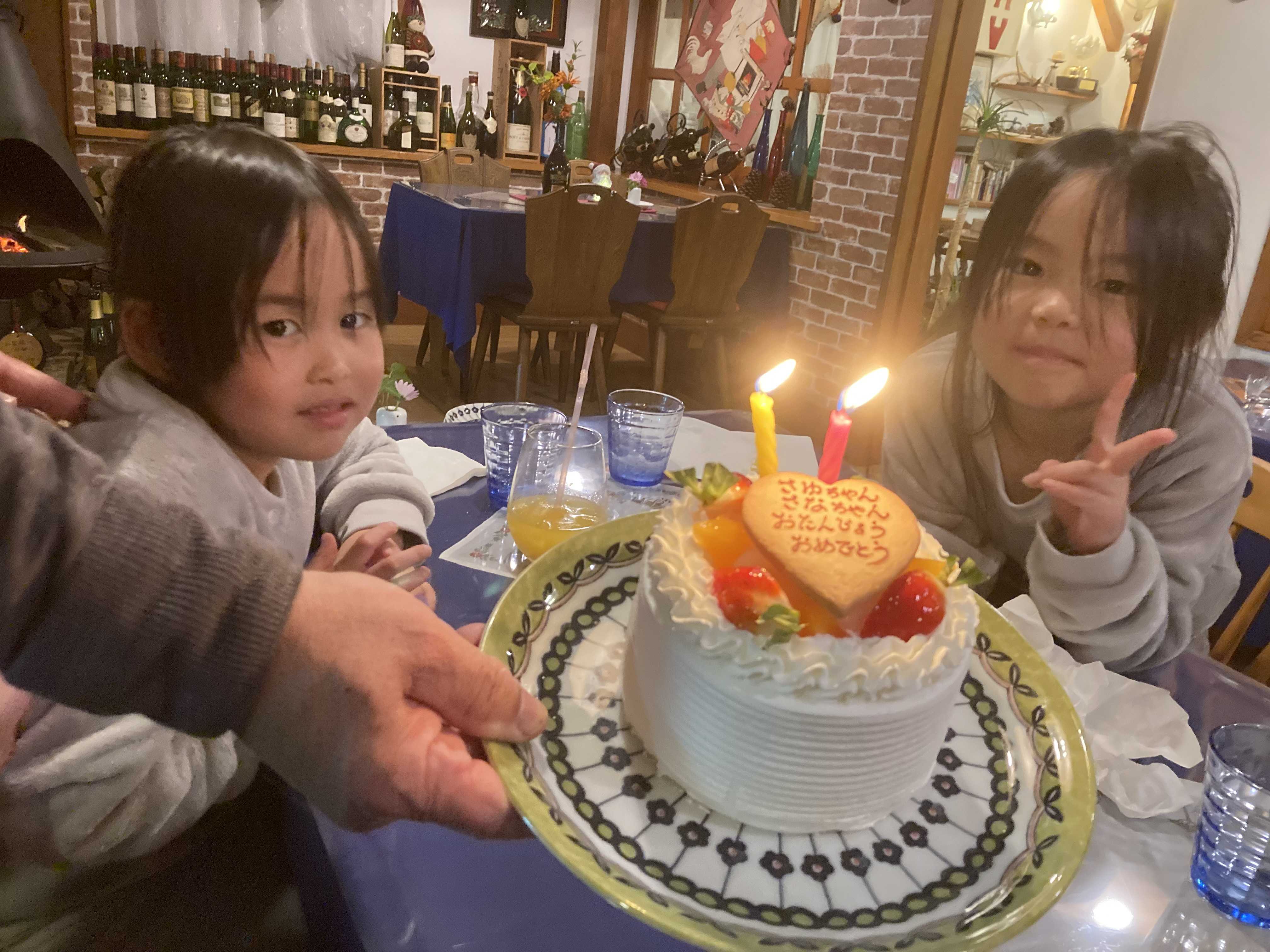 ご宿泊いただいた、SちゃんとSちゃんです。2人は、小学1年生。2人は、TWINS.2人のお誕生日でした。ケーキでお祝いしました。おめでとうございます!阿蘇を楽しんでくださいね。スイス料理&ワインの宿 ペンション木の実ペンション木の実のHPへ楽天トラベルペンション木の実のページへ
