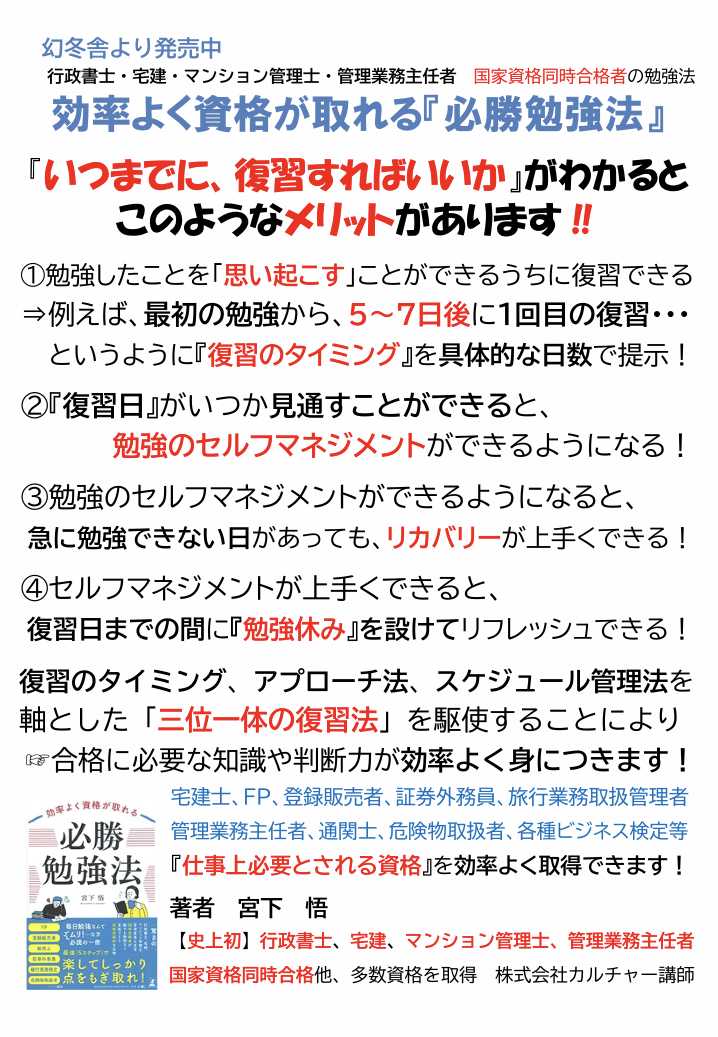 資格試験は、必ずしも「取りたい人」ばかりが受験するものではありません。 特徴としては ①勉強したことを思い起こせるうちに復習できるよう 例えば 1回目の勉強から、5~7日後に2回目の勉強... というように復習のタイミングを具体的な日数で提示 ②過去問を5回繰り返す中で 勉強回数ごとに段階的にレベルアップできる アプローチ法の提示 ③自分自身で「勉強をセルフマネジメント」できるよう 『勉強記録』を使って復習のタイミングに沿って 復習できるようにするためのスケジュール管理法の提示 という『三位一体の復習法』により、合格に必要な知識や判断力が着実に身につくようになる。 これに加えて ④復習を繰り返す中で「弱点」の把握と絞り込みを行い、試験直前期に絞り込んだ弱点を徹底的につぶすことにより『得点源』に変える方法により、試験直前に得点力を伸ばすことができる。 というものです。 効率よく資格が取れる『必勝勉強法』は、 通常の書籍の他、電子書籍版も併せて発売中です!! ![]() お気に入りの記事を「いいね!」で応援しよう