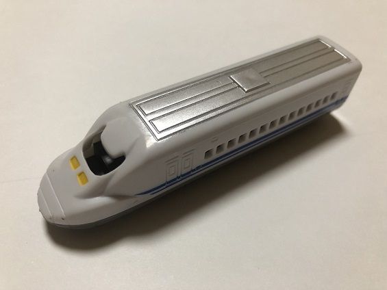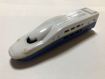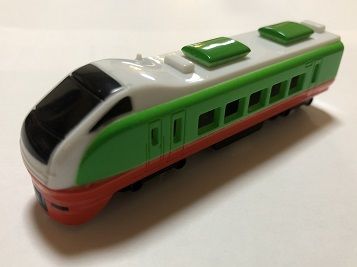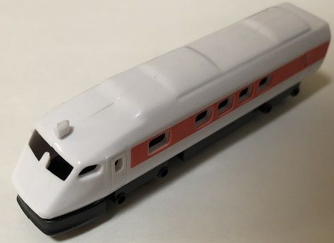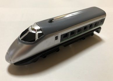以前ご紹介した神崎レンタルサービスの「トレイン」シリーズについて,今回は詳しく見ていきたいと思います。 [追記1]2019年11月,大阪のヨドバシカメラ梅田店5階,富山のマリエとやま5階に設置されているのを確認しました。また,コメント欄でいただいた情報によれば,ニューシャトルの鉄道博物館(大成)駅にも設置されているとのことです。 [追記2]2022年,神崎レンタルサービスが廃業したとの情報が入りました。商品は店頭在庫限りになると思われます。 ![]() ![]() ![]() [追記3]神崎レンタルサービスの「トレイン」シリーズですが,どうやら以前は「丸越」という会社から発売されていたようです(箱には,「マルコ トレイン」と記載されています)。 バンダイの系列にも「丸越」という会社がありましたが,ロゴマークが一致しないので,別の会社でしょうか?(参考1「風雅堂・日常雑記」ttp://fu-gado.blogspot.com/2012/01/blog-post_02.html) (参考2「RH18Vのミニカーの館」ttp://minicar555.blog.fc2.com/blog-entry-413.html) <蒸気機関車> 蒸気機関車は,2種類を確認しています。 下回りは共通で,後部にアーノルドカプラーと同じ形状の連結器を備えています。 1つめは,C11と思われるタンク式機関車。ほぼNスケールです。 ![]() 2つめは,古典的なスタイルのタンク式機関車(古典機には詳しくないので,形式はわかりません。すみません・・・)。こちらは,Nスケールよりかなり大きな車体となっており,猫屋線の蒸機と並べても違和感のない大きさです。 ![]() <国鉄型特急・電気機関車> 国鉄型の特急電車としては485系の先頭車と中間車の2種類,電気機関車はEF65,EF58,EF81の3種類を確認しています。いずれもかなりショーティ化されたスタイルとなっています。 EF65,EF58,485系中間車は,台車とパンタグラフが別パーツとなっており,アーノルドカプラーと同じ形状の連結器を備えた台車が首を振るようになっています。特に,EF65とEF58はボディの彫りも深く,ナンバーも入れられ(EF65 505, EF58 82),玩具としてはピカイチと言っても過言ではありません。 ![]() ![]() ![]() 485系先頭車は,台車枠が床板に固定されており,連結器は,ZJゲージ第1弾のようなフック式のものとなっています。そのため,中間車とは連結器の形状が全く違いますが,連結できないこともなさそうです。 ![]() EF81は,後述のJR特急などと共通したつくりの下回りで,連結はまったく考慮されておらず,パンタグラフも車体と一体で,ちょっとパンタグラフには見えないようなスタイルをしています。 ![]() <ディーゼル機関車> ディーゼル機関車としてはDD51の1種類のみを確認しています。ナンバーはDD51 726。 ボディは彫りが深く,なかなか良好なプロポーションですが,JR特急などと共通の下回りのため,上回りとは少しアンバランスな感じがします。私の持っている製品は,黄色車体に赤帯という妙なカラーですが,以前は青色車体に金帯のJR北海道カラーが生産されていたようです。 ![]() <JR特急> JRの特急電車としては253系,E653系,787系の3種類を確認しています。 787系は腰高な感じがしますが,E653系は(色はともかく)なかなかよく特徴をとらえていると思います。 ![]() ![]() ![]() <新幹線> 新幹線としては0系,300系,WIN350,500系,700系,N700系,400系,E3系,E4系,E6系の10種類を確認しています。 0系は485系先頭車と同様の下回りでフック式の連結器を備えています。他は連結器はありません。0系,300系は腰高が目立ちますが,E3系やN700系あたりはいい線をいっているのではないかと思います。E6系も,実車と同様の赤カラーと,E5系のような緑カラーとがあります。