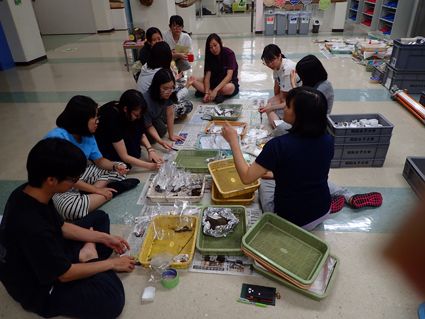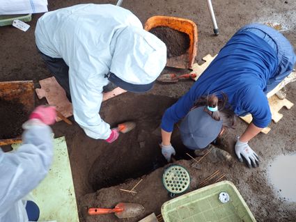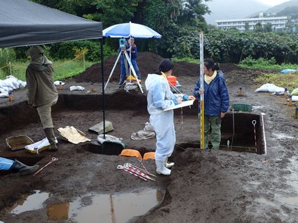 調査もあと3日 ↓24号土坑半截中(終わらない・・・) ![]() 24号土坑の真ん中には緑色の礫 礫の周り、下から土器が出土 何か意味ありげな礫 ![]() こちらは30号土坑半截中(終わらない・・・) ![]() 30号土坑の半截途中 ![]() 実測作業風景 平面図の作成、レベリング ![]() 宿舎にて 夕食後のミーティングが終わると係の仕事(写真は遺物係) ![]() 明日現地説明会開催 9月22日(土)14時~16時 この間はいつでも、ご説明します 中屋敷遺跡 相模金子から徒歩20分(上りなのでかなりきつい) 新松田駅からタクシー 山田の内田酒店斜め向かい(中屋敷遺跡の案内版あり) *ひょっとしたら「やしきちゃん」が見られるかも、かも *先着10名の方に「特製やしきちゃん野帳」プレゼント と言っても当日告知しても!ですよね なお、佐々木先生による中屋敷遺跡フェイスブックでも詳しくお知らせしてます そちらは英訳もあり、おばはんの戯言と違い充実しています 是非ご覧ください → 中屋敷遺跡調査団 お気に入りの記事を「いいね!」で応援しよう