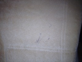 岐阜県は 大垣市 神戸町 池田町 揖斐川町のところクリーニングの窪田です。だいぶ暖かくなりましたが、季節の変わり目に体調を崩すことは、本当よくあります。しばらく気を付けたいです。それでは、本日のしみ抜きです。ピーチスキン状(ポリエステル)のジャンパーにボールペンです。傷がつきやすいので、要注意です。取れました!