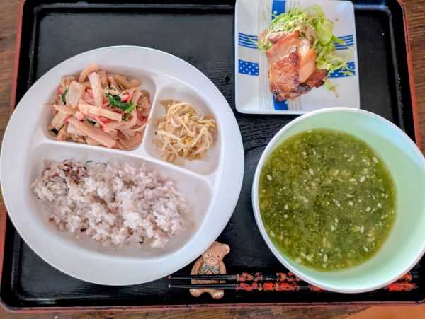 1月22日(木)旧暦1月4日 六曜は「先負」 我が家のカイワレは順調に生育中、1日の伸びが早くて、夕方にはさらに大きくなります。 <前夜> <今朝> 小学生でも出来るカイワレ栽培に、ババながら没頭している自分に笑ってしまいますが、コレ失敗しないので、成功体験を積むのに役立つのです。成功体験を積むと自分に自信が持てるようになるので、行動に広がりが出て来るのです。ババ解釈ですけど。 なにしろカイワレのようなスプライト野菜は、栄養価が高く成長するための力がいっぱい詰まっているので、食べても絶対損はありません。 私も積極的に作り出したのは昨年からですが、楽しく愛情込めて作っていますから、この効果は倍返しだと勝手に思っています。抗酸化作用、皮膚の乾燥を防ぐ、その他諸々効果大、そのうち身体が教えてくれるでしょう。たかがカイワレされどカイワレです。 今年は流れのままに、目の前に流れ着くものを一つ一つこなしていく、と言うイメージでスタートしましたが、なぜだか、思い付きやら流れ寄るものやらが多すぎて、振り回されそうです。自由時間がたっぷりあるはずなのに、追っつきそうにありません。 インドア生活に浸かりすぎ、年齢も相まって動きが鈍くなっているのを痛感します。 今日は裏庭の前哨戦のつもりで、表の歩道の植栽マスの整理を始めたら、それだけで時間が終わってしまいました。 仕方なく、先日食べ過ぎの胃の調子を見ながら、今日も軽い食事。 お子様用のお皿は、量を少なめに調整出来てなかなか良いのですが、私はそれだけでは足りないので、チキンを1個追加、恥ずかしながら、冷凍していた余ったおかずやご飯を解凍しただけと言うズボラ飯です。 一応夜はちゃんと、エノキダケの野菜炒めとオクラ入り納豆を食べましたけど、ほとんど手間なしのご飯でした。