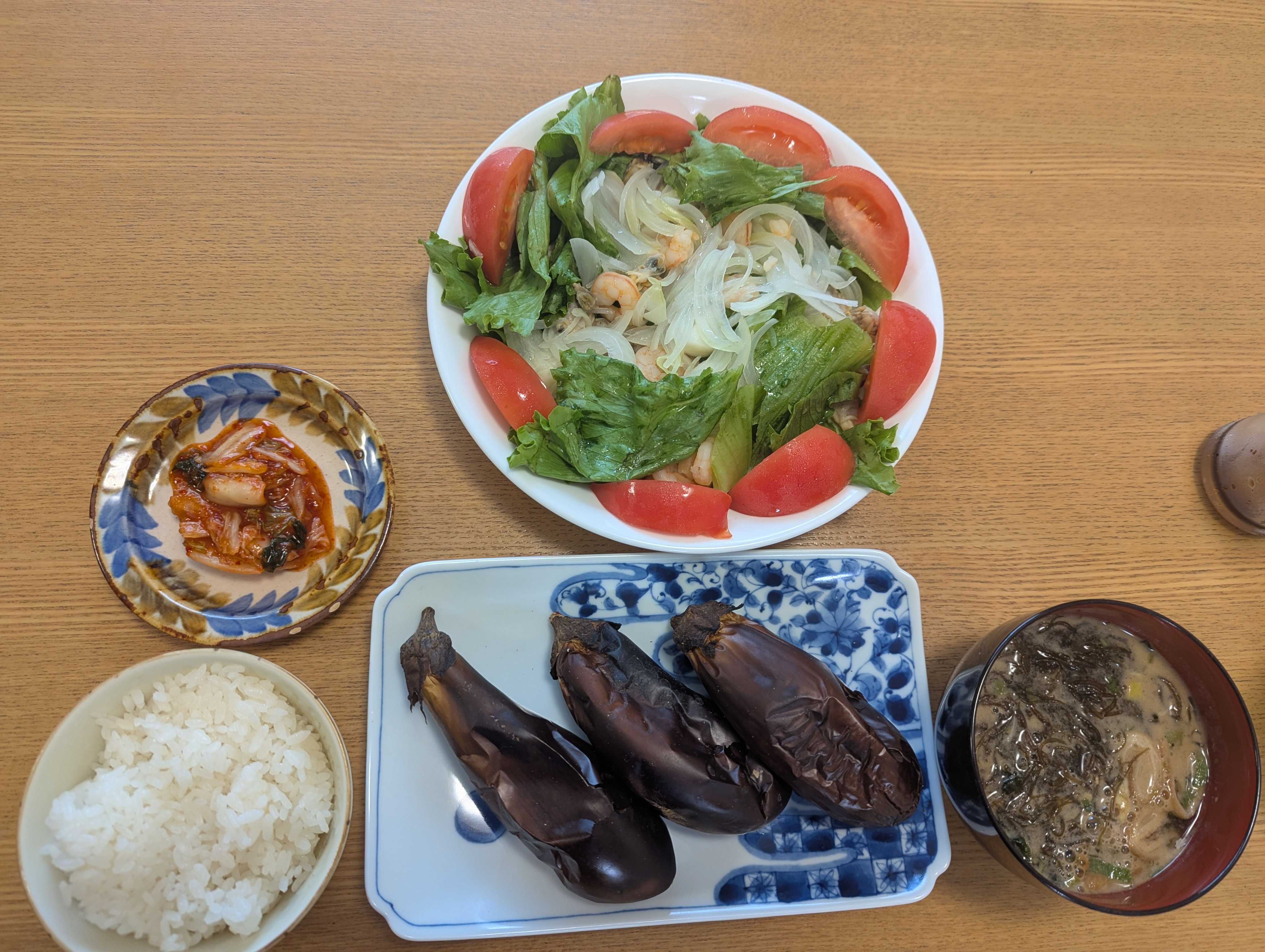 今日のランチはヘルシオにお任せの焼き茄子と冷凍シーフードミックスと玉ねぎを茹でフレンチドレッシングをかけた、シーフードマリネ、キムチ、市販の味噌汁に具を追加した、もずくの味噌汁。まだ暑い。なんて暑いんだろう。人類総我慢大会みたい。良かったら見てってくださいね♪