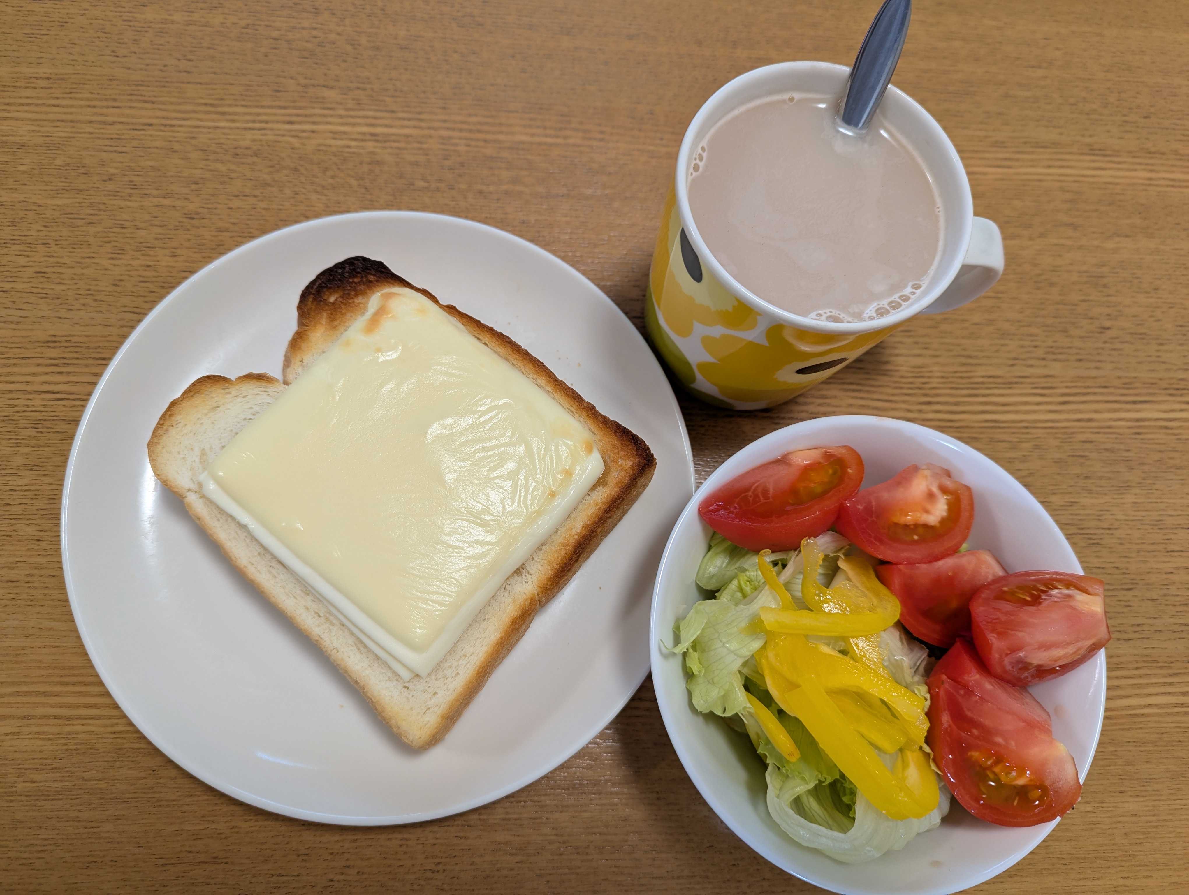 今日のランチは、はちみつ+スライスクリームチーズ2枚+とろけるスライスチーズ1枚のチーズトーストとサラダにミルクティー。良かったら見てってくださいね♪