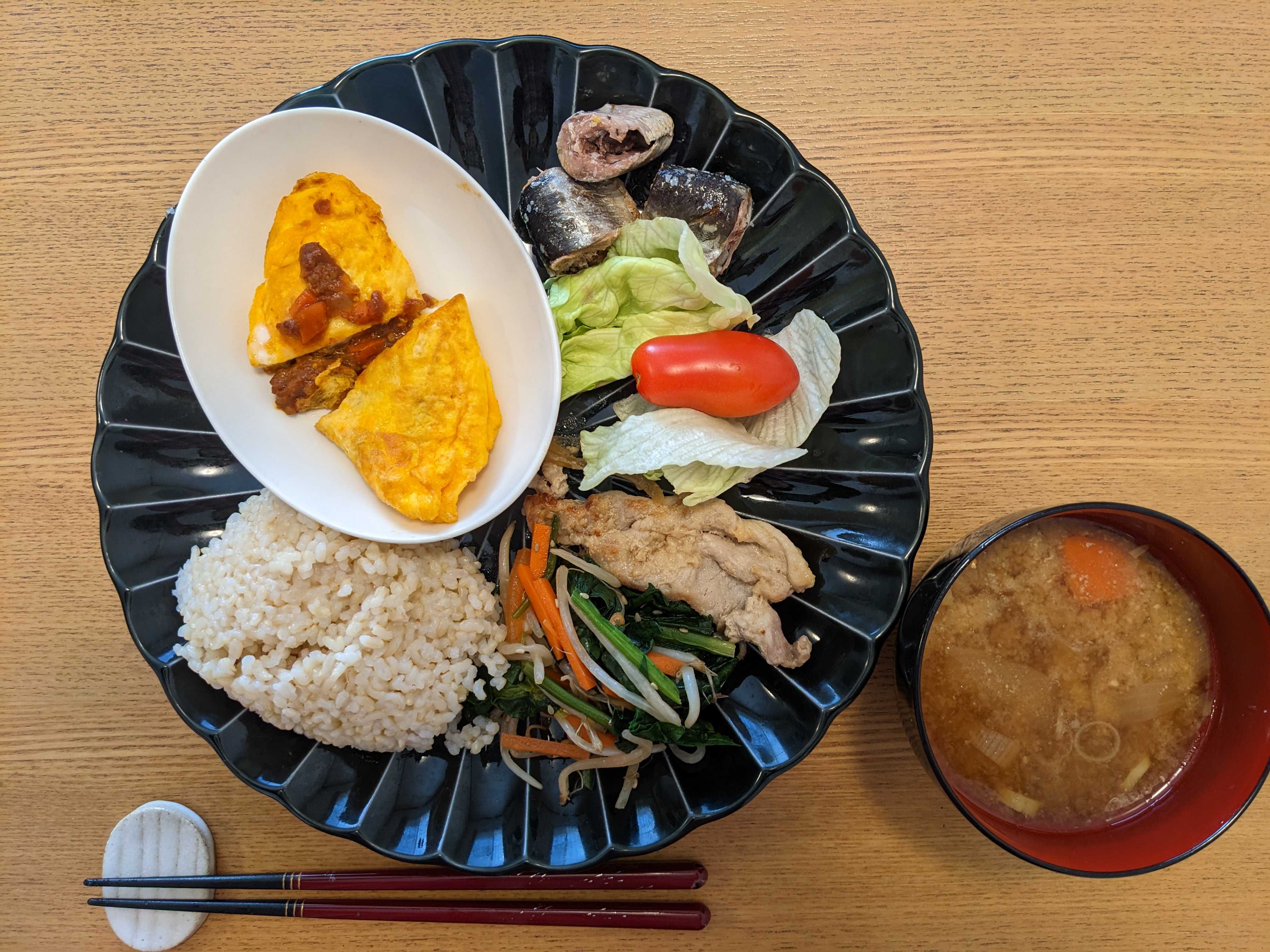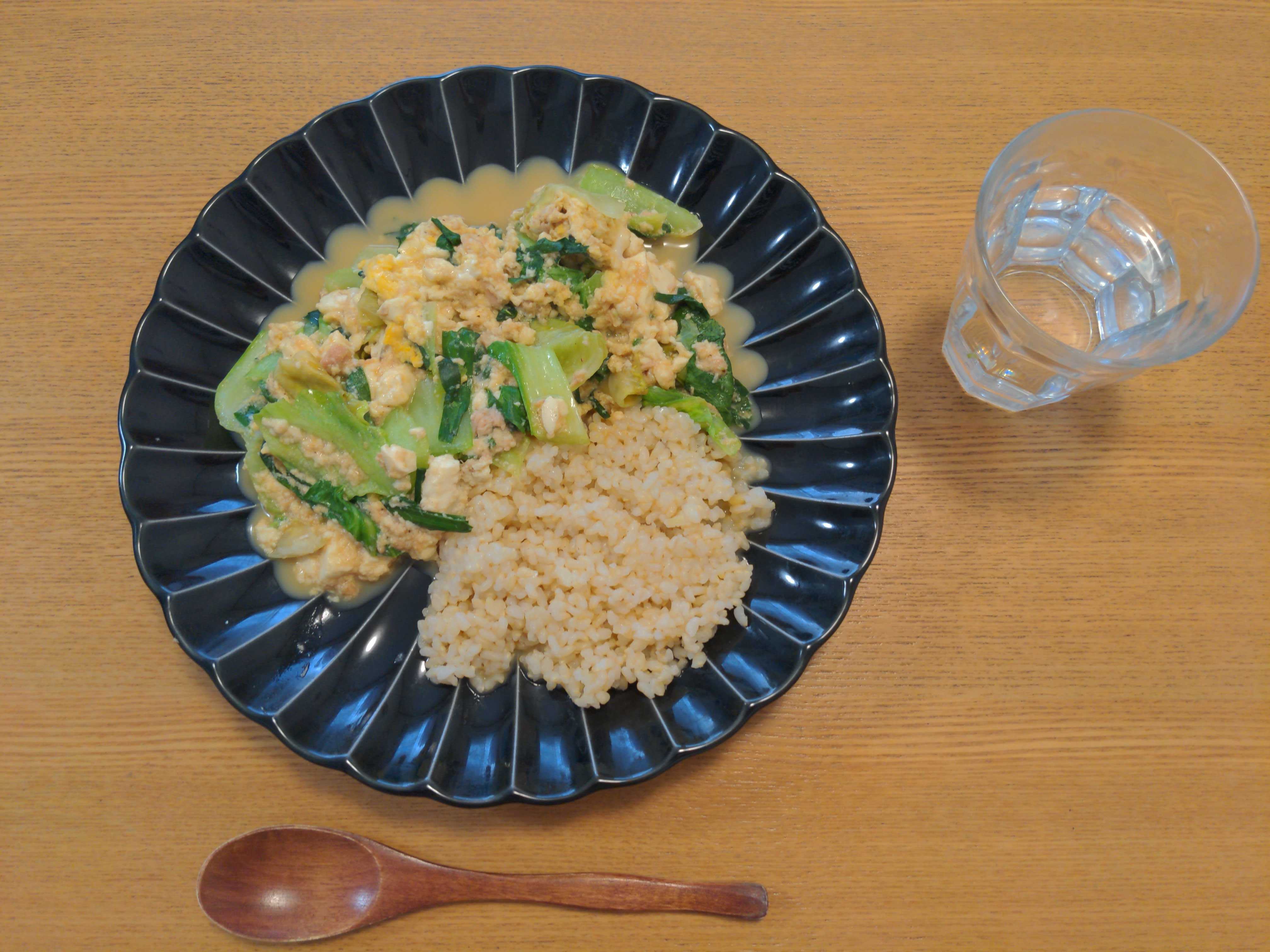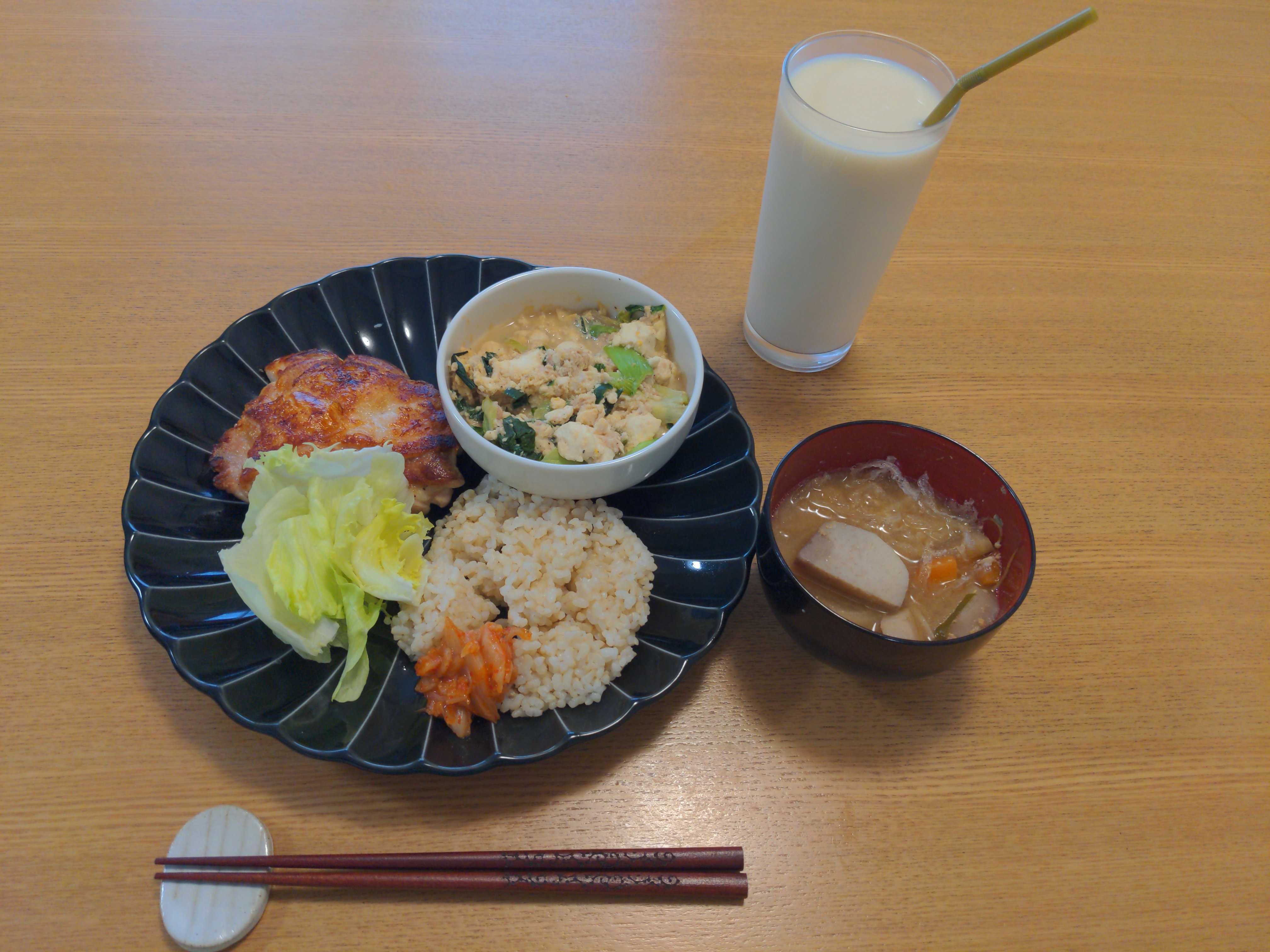 チキンソテーチャンプルー玄米ごはんキムチレタス豚汁甘酒のオーツミルクオレ 1:1