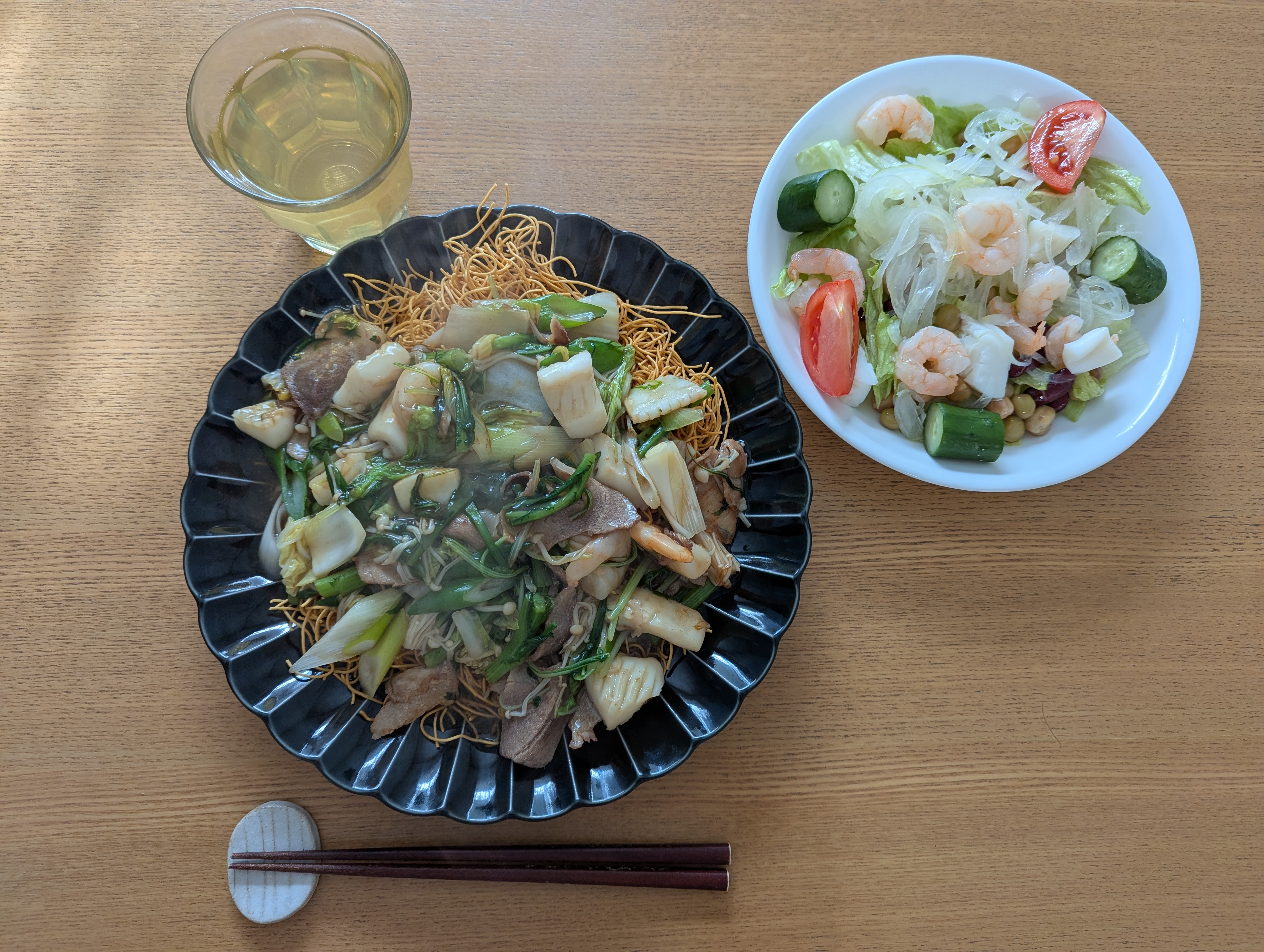 今日のランチは皿うどん、シーフードサラダ。皿うどんには一昨日の鍋の残り野菜で。両方とも冷凍のシーフードミックスを利用して。魚介類大好き♡ 結局一袋使いきって。ちょっと食べ過ぎ良かったら見てってくださいね♪