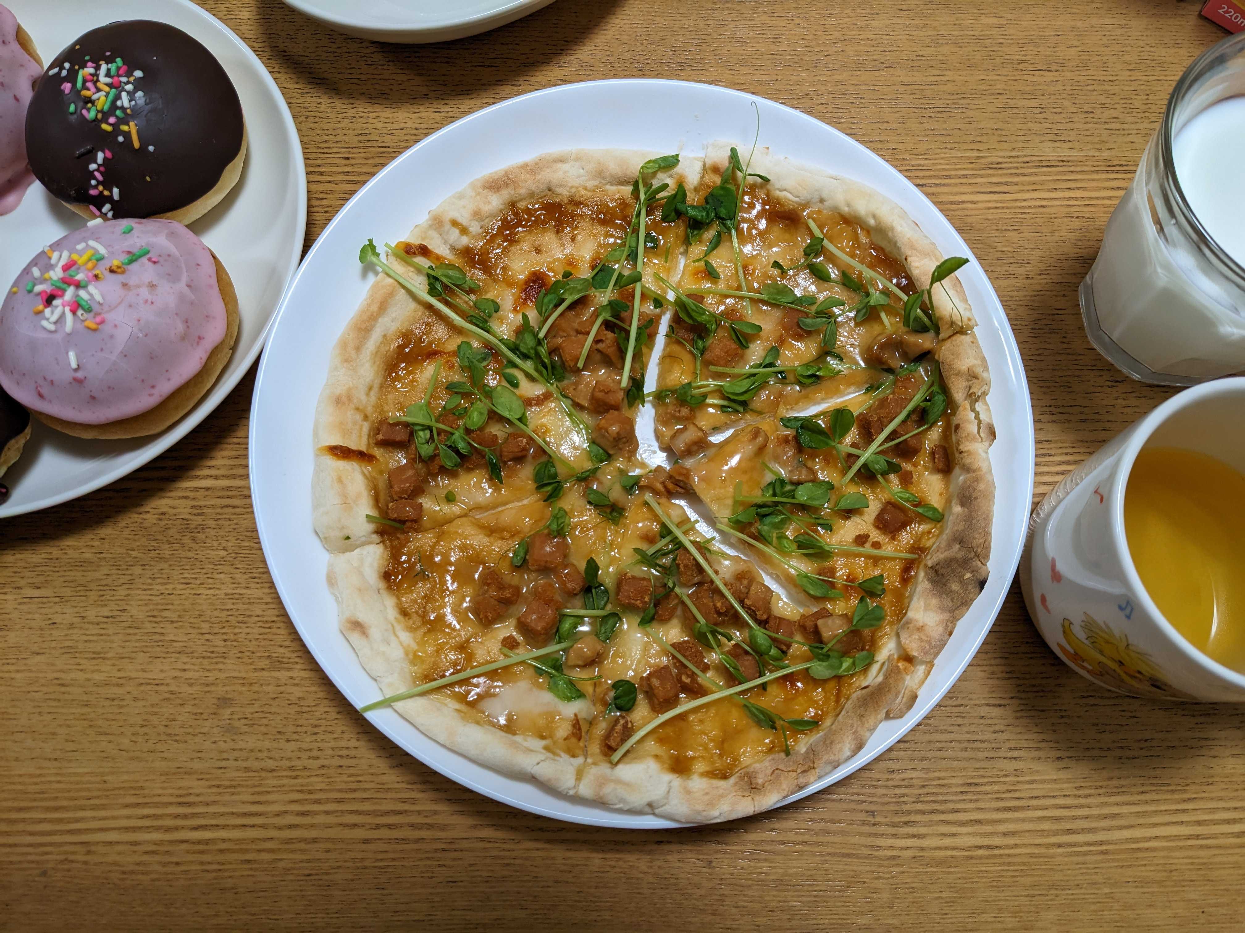 照り焼きチキンピザに豆苗のトッピングずっと食べてみたかった菓子パンと。