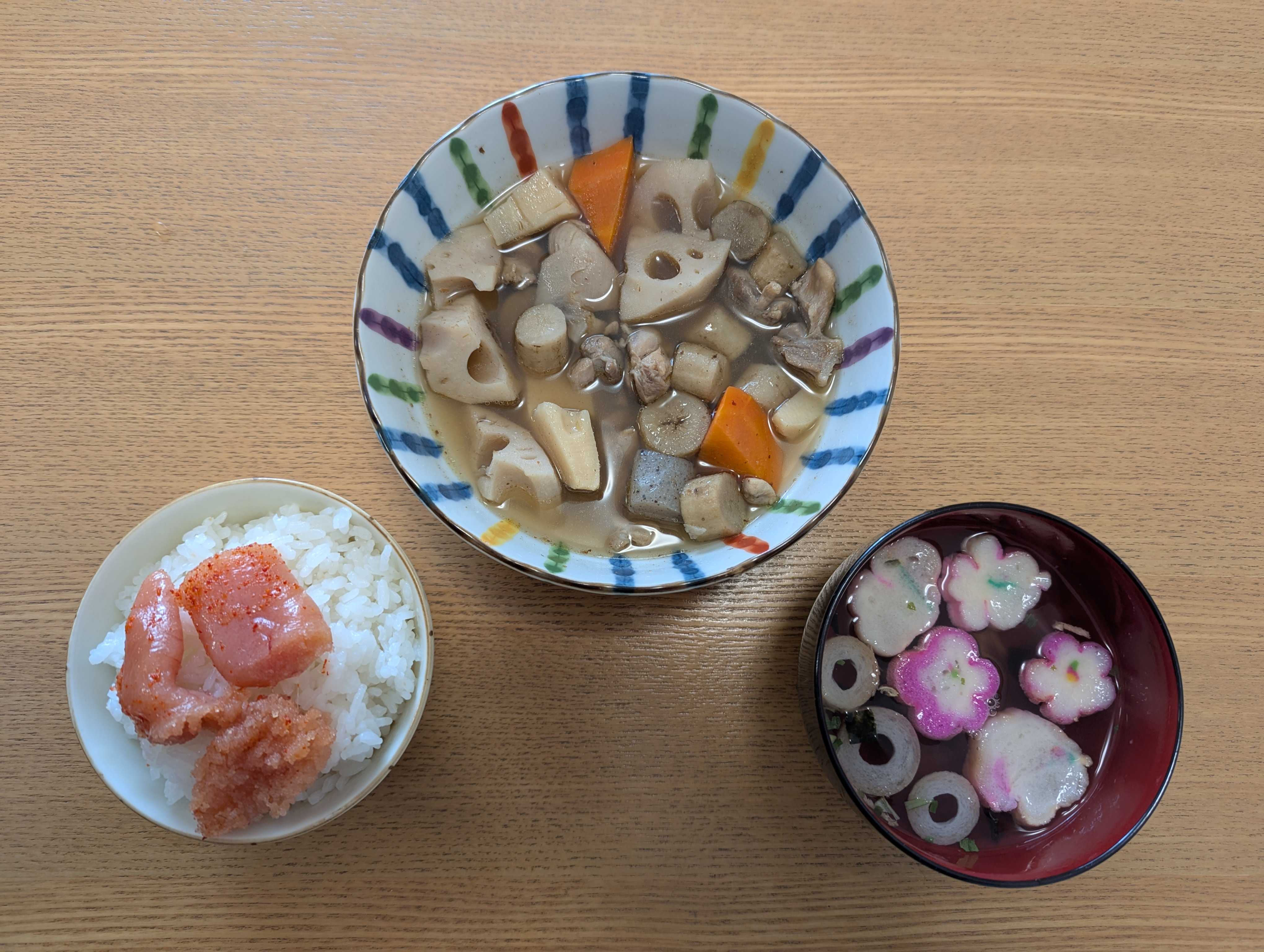 今日のランチは一昨日のいり鶏、ご飯に明太子、お吸い物に花麩入れてみた。良かったら見てってくださいね♪