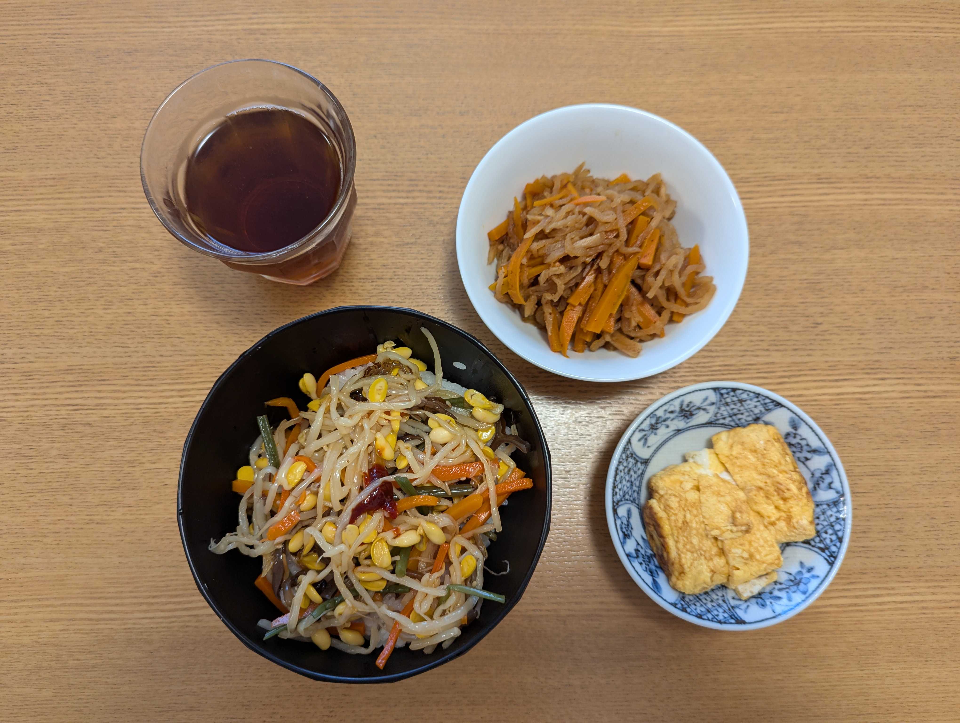 業務スーパーで買ったビビンバでどんぶり。息子の弁当の残りのだし巻き卵と残りの切り干し大根の煮物を添えて。良かったら見てってくださいね♪