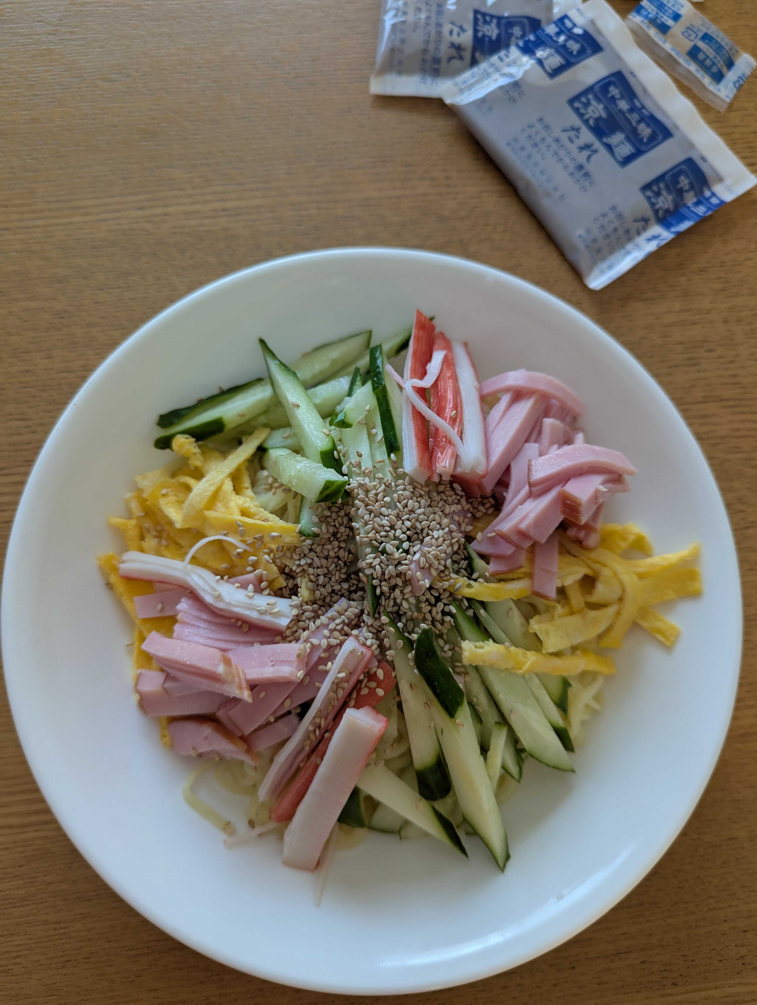 今日は冷やし中華。高校生の次男は鶏ささみ肉があんまり好きではないらしい、せっかくレンジで200wで1本2分蒸して入れたのに。7月に全然手を付けなかった宿題やれや〜。大学生の長男も明後日から帰ってくるし、また窮屈になるなあ。良かったら見てってくださいね♪