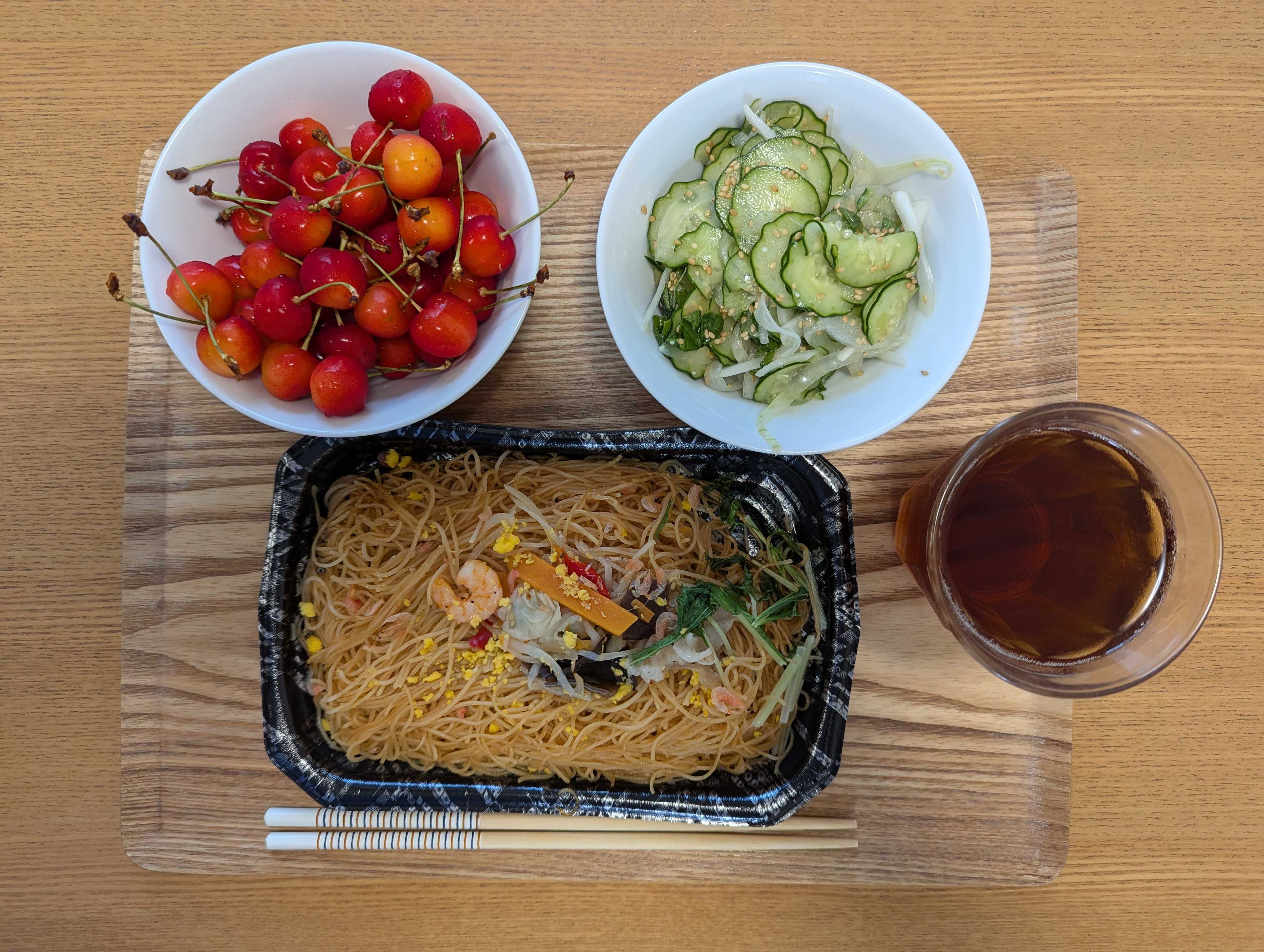 スーパーベルクでビーフンを購入。蒸しエビ一個、桜エビ沢山かい〜。あときゅうりと玉ねぎの青じそサラダ、半額だったけれど、さほど傷んでないさくらんぼ。さくらんぼは半分残して息子のおやつに。高1の息子は三者面談と期末考査の間の午後授業。もうすぐ夏休み、どうしたい?と聞いたら「家に居たい」あ〜つまらん奴になってもーた。大阪万博行くの却下されたからか。思春期難しい!良かったら見てってくださいね♪