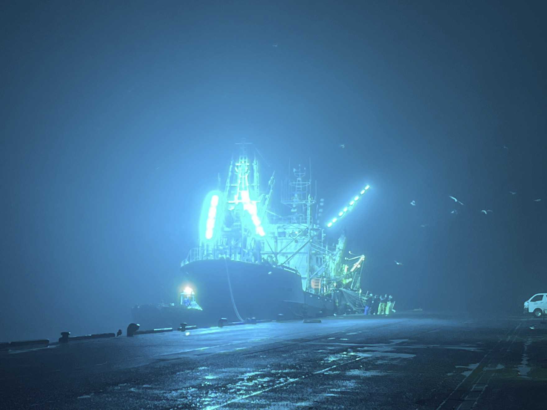 これは月曜日だが、濃い霧の中、港が緑色に光っていたので見に行ってみた