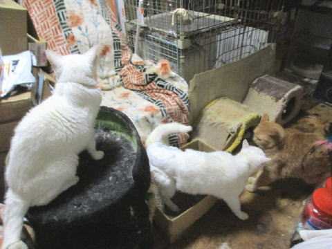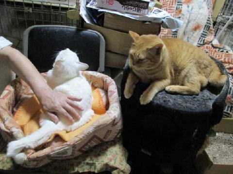 剛♂ 目は目やにとかでグチョグチョ、鼻は詰まってるし、クシャミに咳もあって、診察に検査して、 注射して目薬に飲み薬を貰って帰ってきて、2~3日で目も鼻も良くなりつつあるなぁ~と思ってたら。 8日の夕方、急に後ろ足が立たなくなり、タロウと同じで心筋症だろうなぁ~と。 急遽、ホワイト♂を元の純♂のケージに戻し、三段目は上がれないように閉鎖して、 一番下に段ボール箱を置いて、二段目にも上がりやすいようにして、剛♂を移動させました。 ![]() コチャ♂と離れて新しいケージの中の一段目にいる剛♂ 次の日に獣医さんとこに行って、診察に検査して、やっぱり心筋症で、飲み薬を貰って帰宅。 水は飲まない、フードは食べないので、シリンジで強制給仕。 わかってることだけど、短い時間に何回もやるから嫌がるんだよねぇ~。 でも、嫌がっても無理やりでも、シリンジで強制給仕を1週間。 やっと8日目には自分から、ちゅーるやパウチ(細かくすり潰し)に口をつけるようになって。 10日目には、カリカリも少し食べるようになって。 まだ、ちゅーるとパウチばかりだけど、カリカリも少しずつ量も増えていって。 ![]() まだ後ろ足はダメなのに、自分のケージに入ろうとしてる剛♂ ロンボー上で見てるコチャ♂ ![]() 足元にホワイト♂ 14日目には、後ろ足の動きがよくなってきたみたいで。 まだ完全じゃないけど、だいぶ回復したので 16日目に元のコチャ♂のいるケージに合流しました。 ![]() 後ろ足回復中の剛♂ 爪とぎ箱の天♂ まだ、剛♂の様子見は続いてます。 後は、 父ちゃん 涙腺の手術後に炎症を起こして、7月は二回行くことになって。 母ちゃん 7月は、バタバタした日が多かったです。 1日は~~ 最低気温24.3℃ 朝から、晴れ 今日も猛暑日、暑い暑過ぎる一日でした。 2018年01月07日の日記←26匹の猫達 お気に入りの記事を「いいね!」で応援しよう