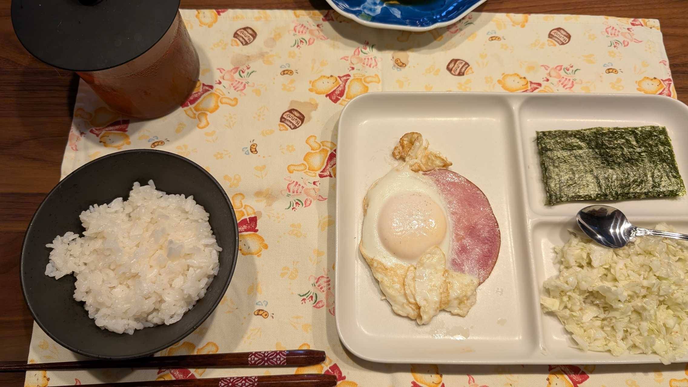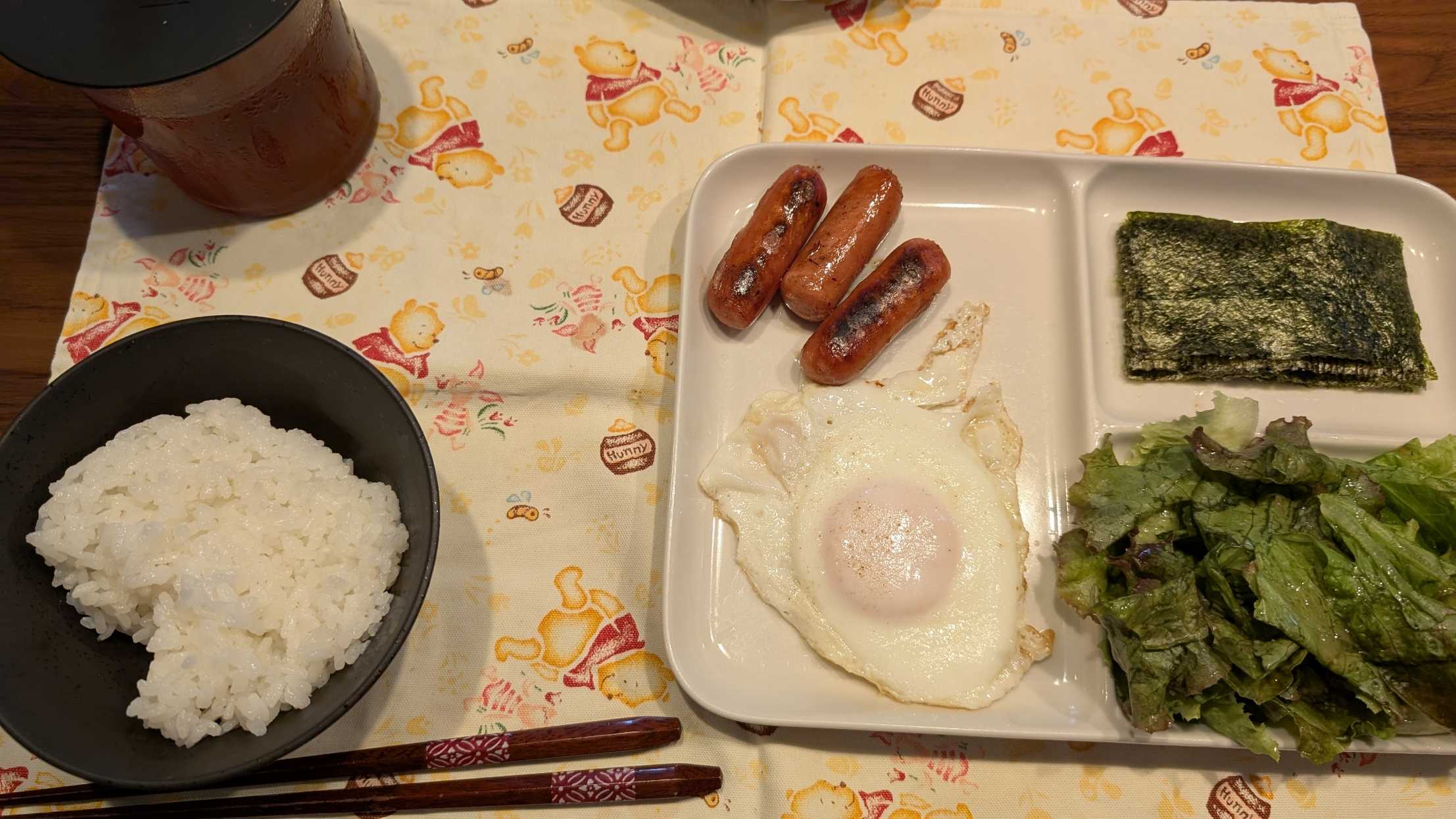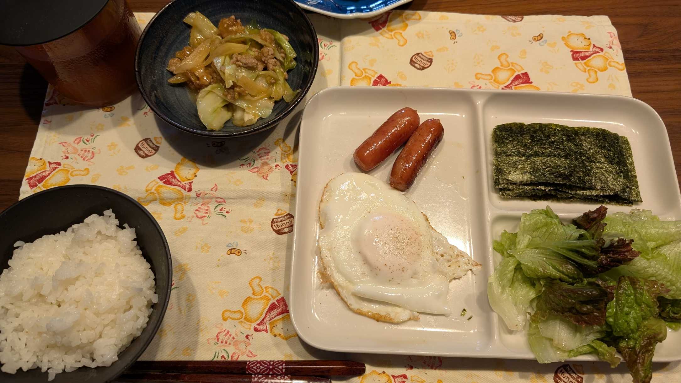 朝食→ウィンナー2本、目玉焼き、キャベツの肉味噌炒め、焼きのり、ご飯、ルイボスティー朝食後→コーヒー昼食→サラダ、ブルーベリージャムヨーグルト、ツナチーズトースト、牛乳夕食→サラダ、もやしとツナの旨辛和え、海老クリームコロッケ、ザンギ、ご飯、白菜の味噌汁、ルイボスティー