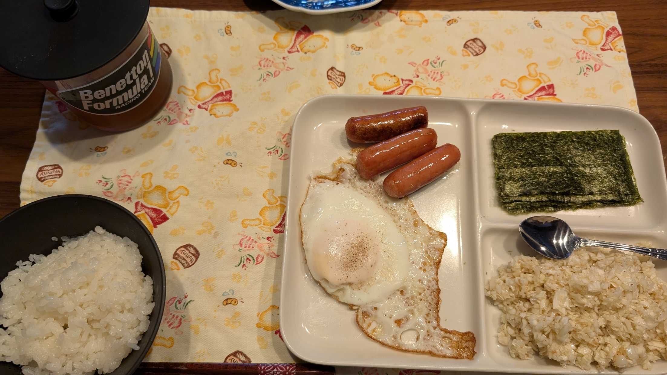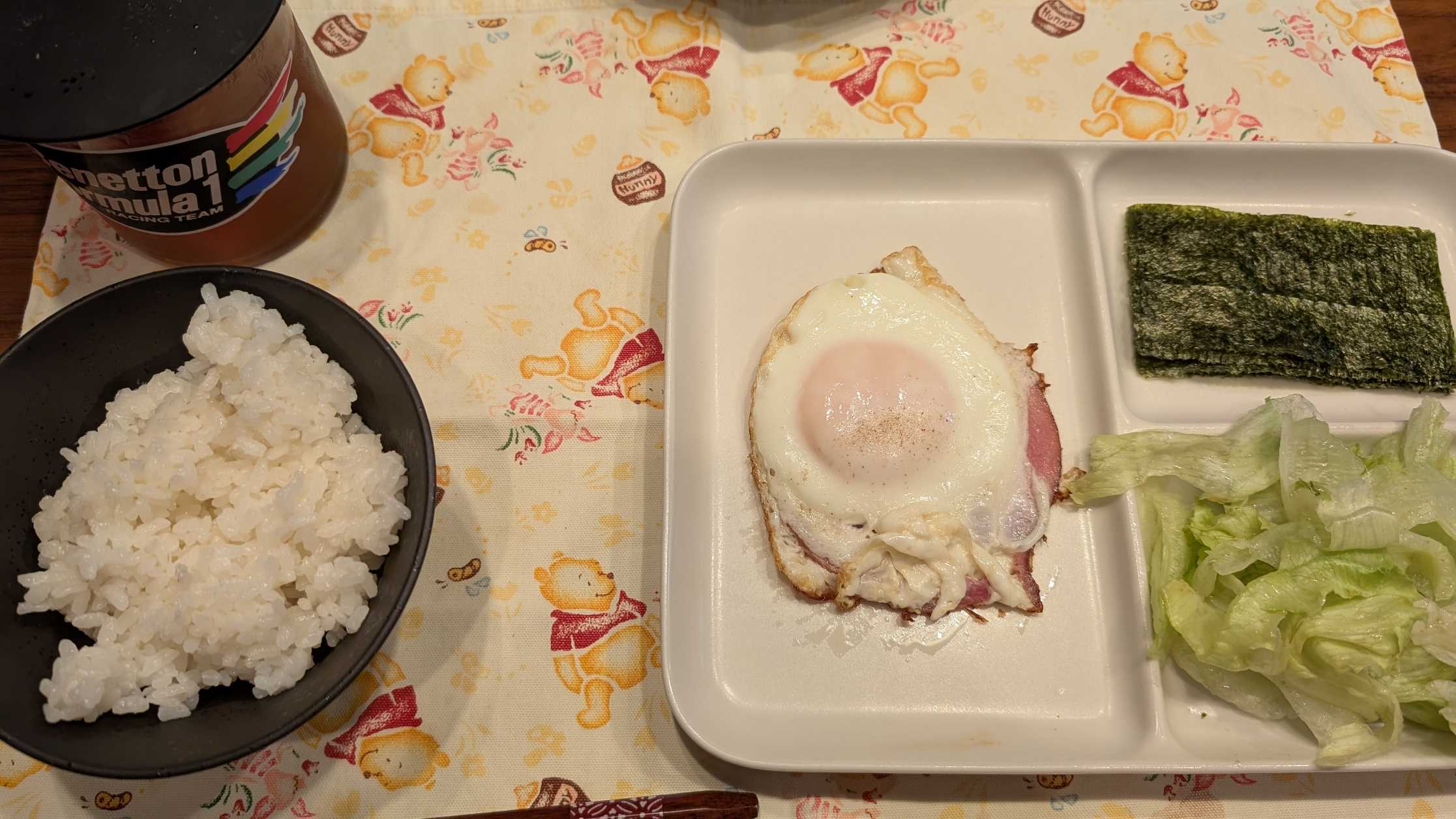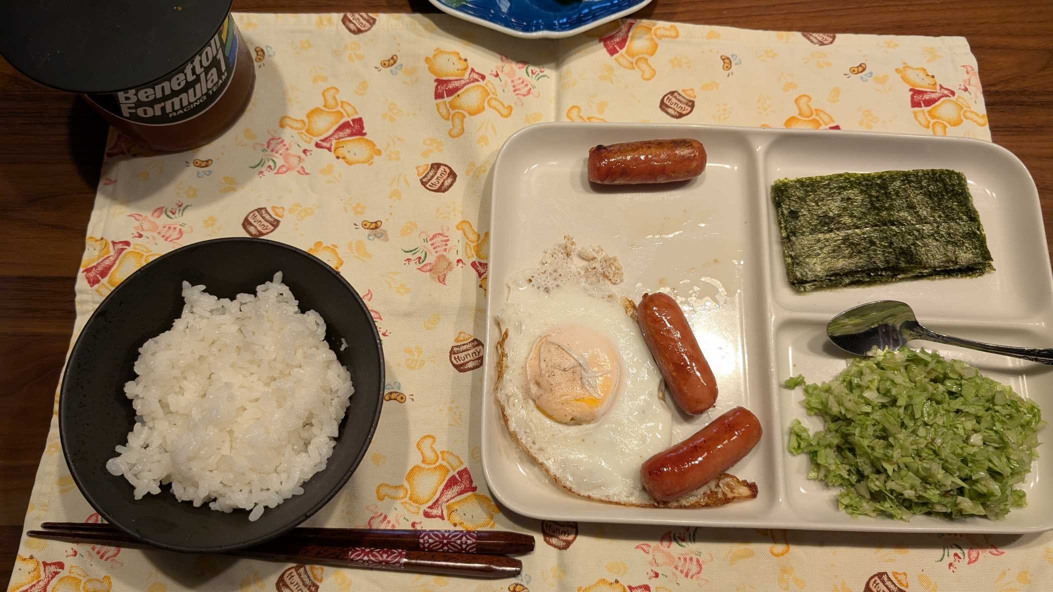 朝食→ウィンナー2本、目玉焼き、キャベツの肉味噌炒め、焼きのり、ご飯、ルイボスティー朝食後→コーヒー昼食→サラダ、ブルーベリージャムヨーグルト、ツナチーズトースト、牛乳夕食→サラダ、もやしとツナの旨辛和え、海老クリームコロッケ、ザンギ、ご飯、白菜の味噌汁、ルイボスティー
