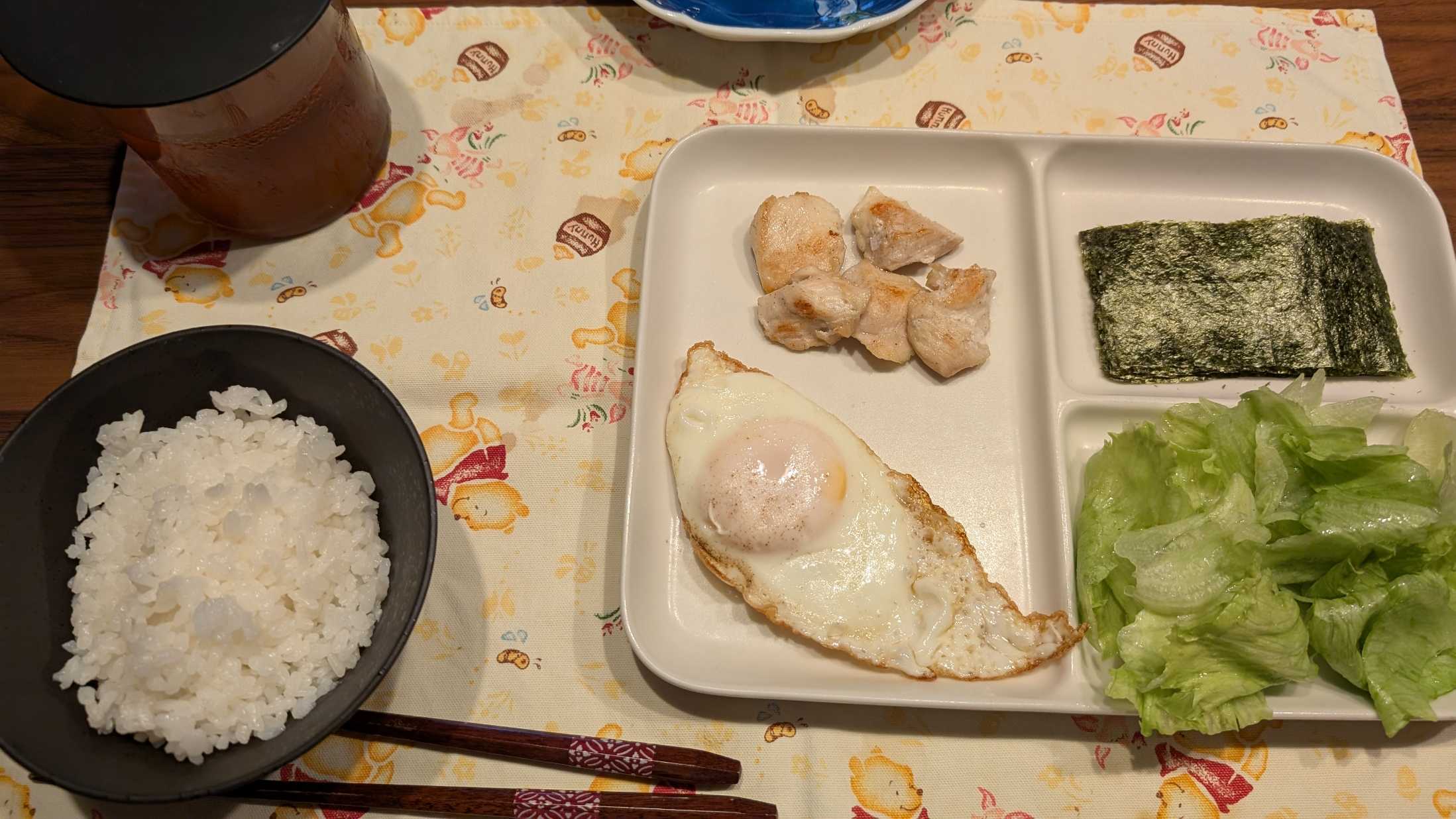 朝食→サラダ、ウィンナー3本、目玉焼き、焼きのり、ご飯、ルイボスティー朝食後→コーヒー昼食→サラダ、ブルーベリージャムヨーグルト、ヤマザキ・タマゴサラダパン、日清・どん兵衛・てんぷらそば、ルイボスティー夕食→サラダ、竹輪と白菜の胡麻マヨ和え、鶏肉の大葉青のりまぶし、ご飯、白菜の味噌汁、ルイボスティー