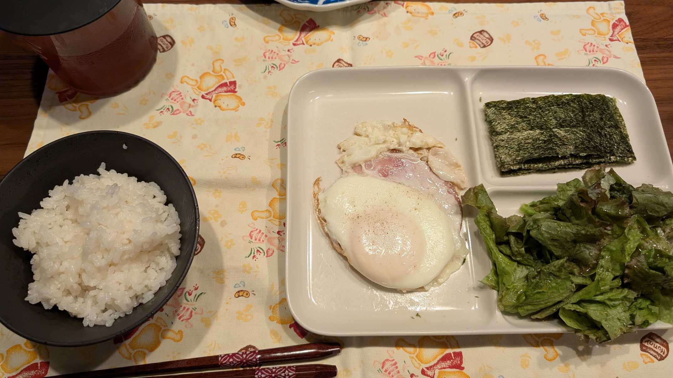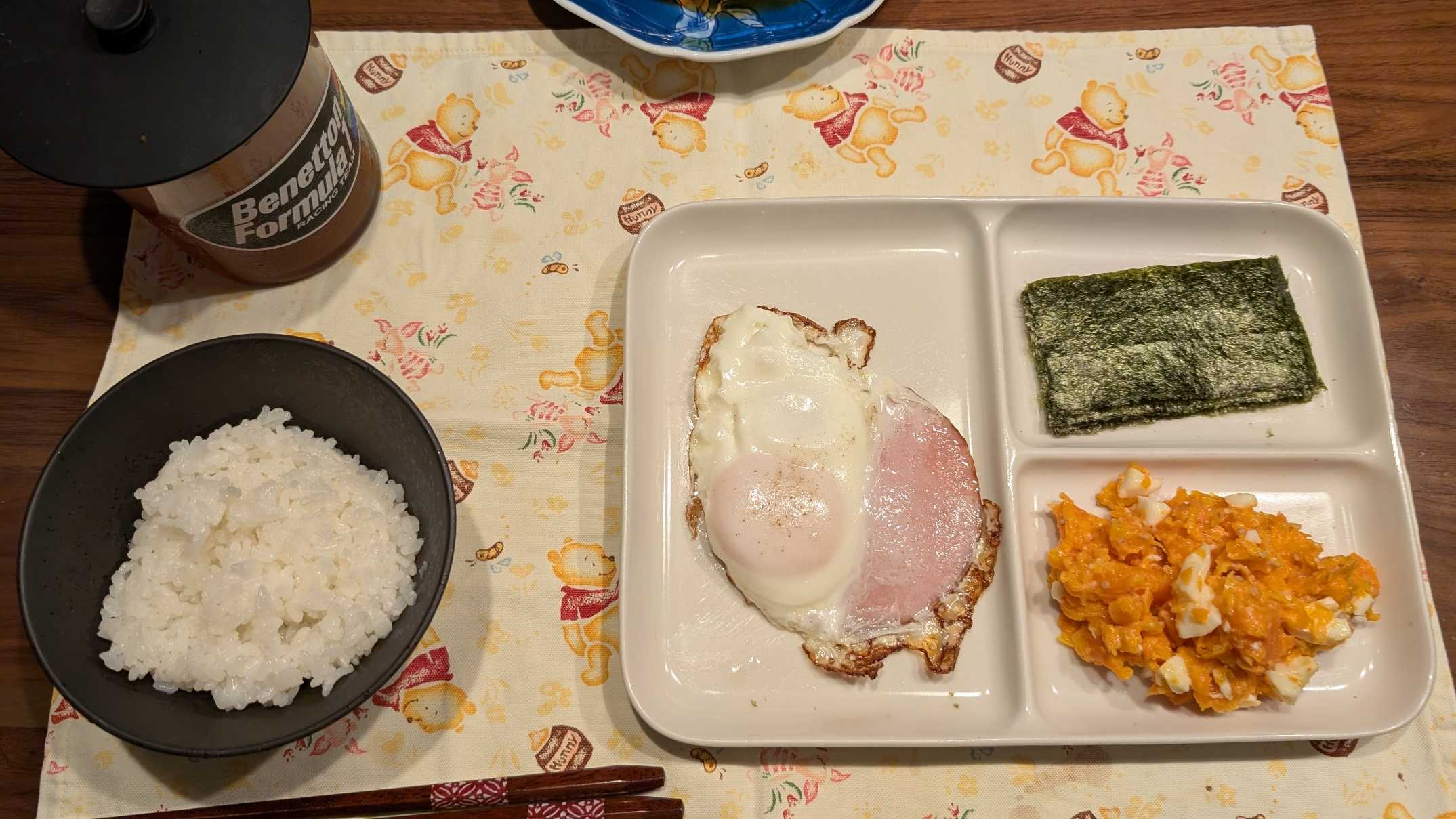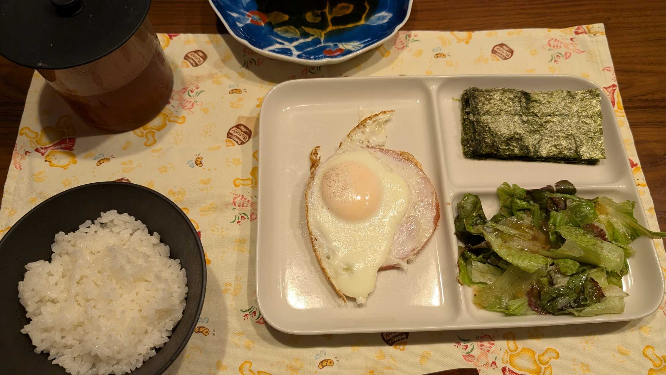 朝食→サラダ、ハムエッグ、焼きのり、ご飯、ルイボスティー朝食後→コーヒー昼食→サラダ、イチゴジャムヨーグルト、チーズハムトースト、牛乳夕食→玉子と人参のサラダ、きゅうりとカニカマのマヨ和え、焼き鳥2本、ご飯、玉ねぎの味噌汁、ルイボスティー