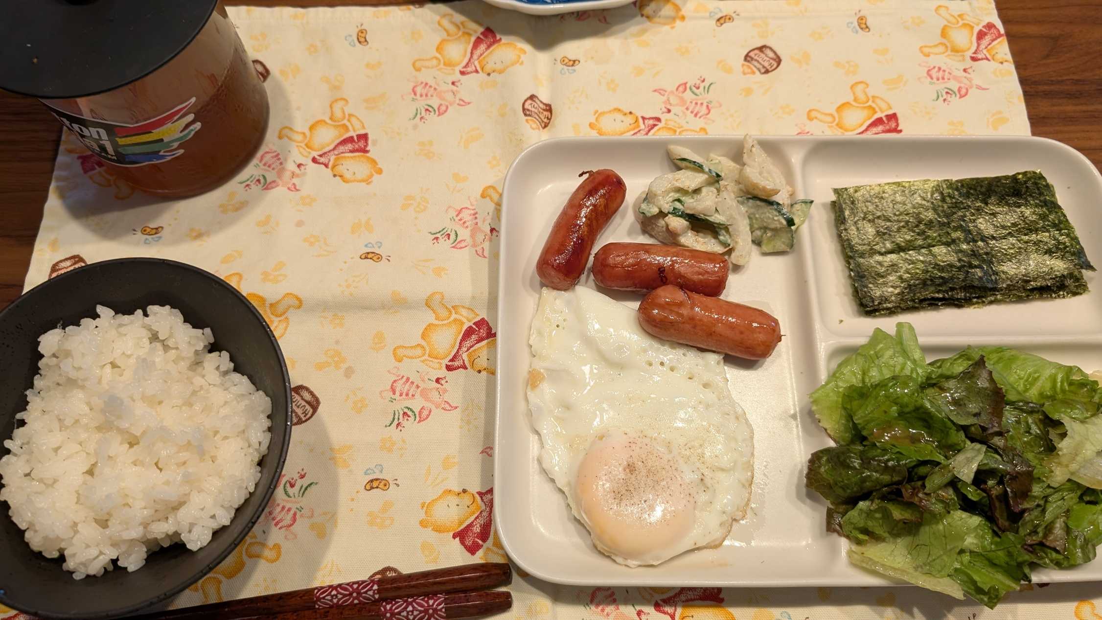 朝食→サラダ、ウィンナー3本、目玉焼き、焼きのり、ご飯、ルイボスティー朝食後→コーヒー昼食→ブルーベリージャムヨーグルト、ツナチーズトースト、豆乳ココア夕食→サラダ、竹輪とピーマンの甘辛炒め、わさび卵納豆、ご飯、きのこのお吸い物、ルイボスティー
