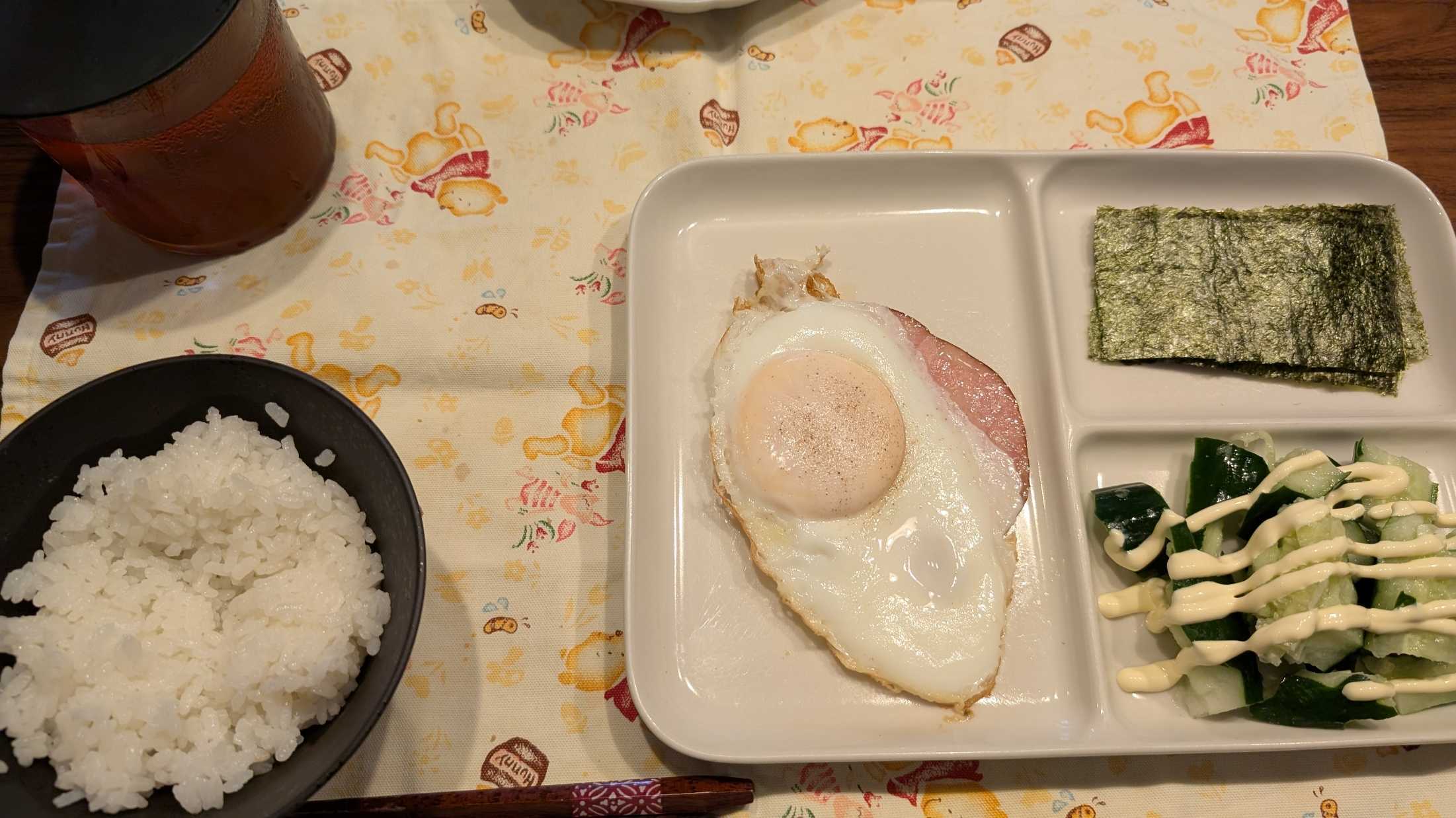 朝食→サラダ、ハムエッグ、焼きのり、ご飯、ルイボスティー朝食後→アイスコーヒー昼食→サラダ、イチゴジャムヨーグルト、スクランブルエッグトースト、牛乳夕食→サラダ、きゅうりとカニカマのマヨ和え、茄子の和え物、ご飯、エノキダケと玉子の中華スープ、ルイボスティー