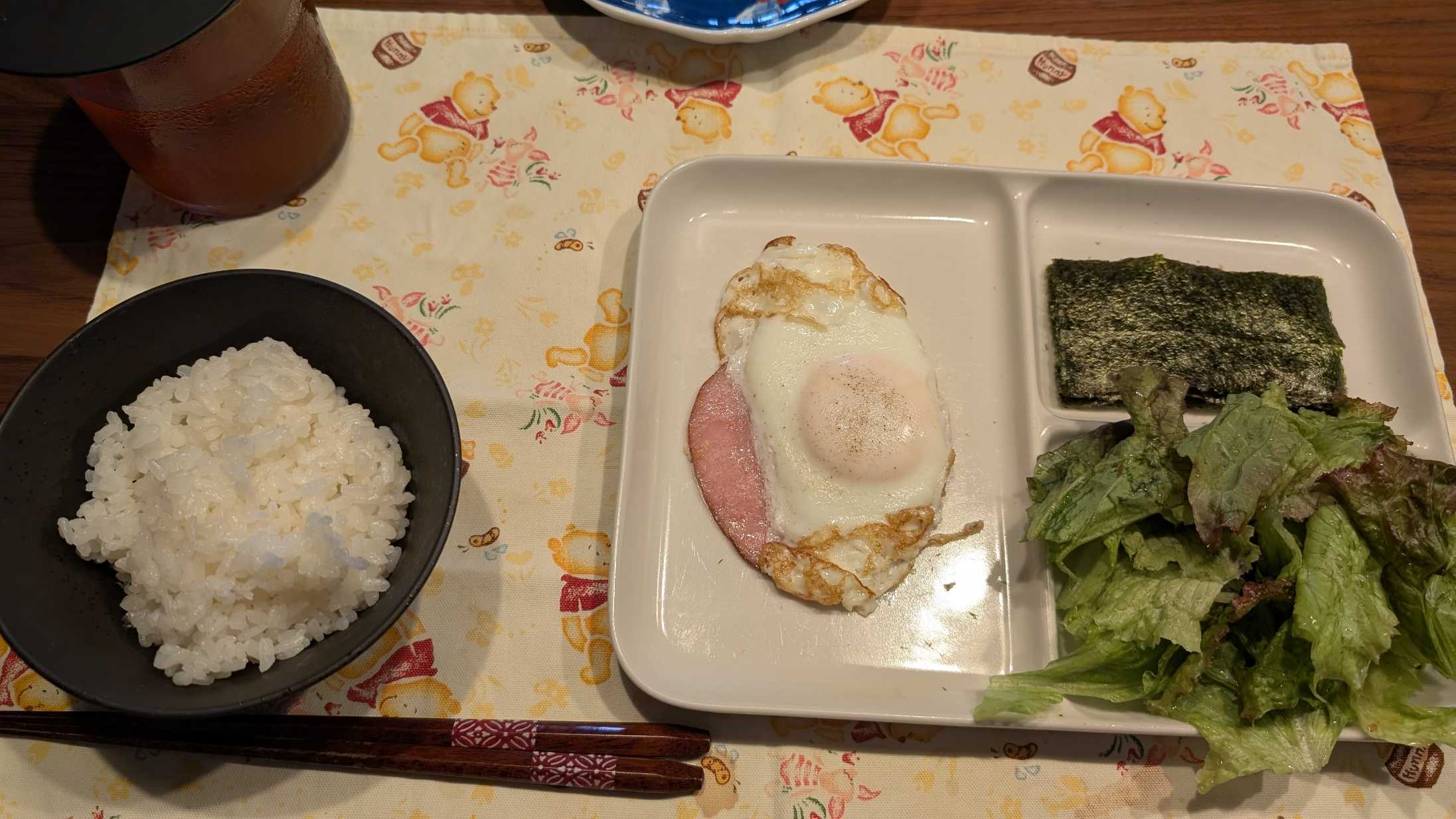 朝食→人参と玉子のサラダ、ハムエッグ、焼きのり、ご飯、ルイボスティー朝食後→アイスコーヒー昼食→サラダ、イチゴジャムヨーグルト、チーズハムトースト、アイスコーヒー夕食→サラダ、ちくわときゅうりのわさびマヨ和え、水餃子、ご飯、しめじのお吸い物、ルイボスティー