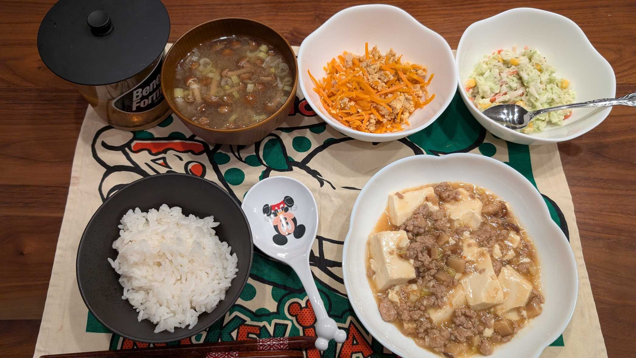 夕食→コールスローサラダ、人参しりしり、麻婆豆腐、ご飯、なめこの味噌汁、ハト麦茶