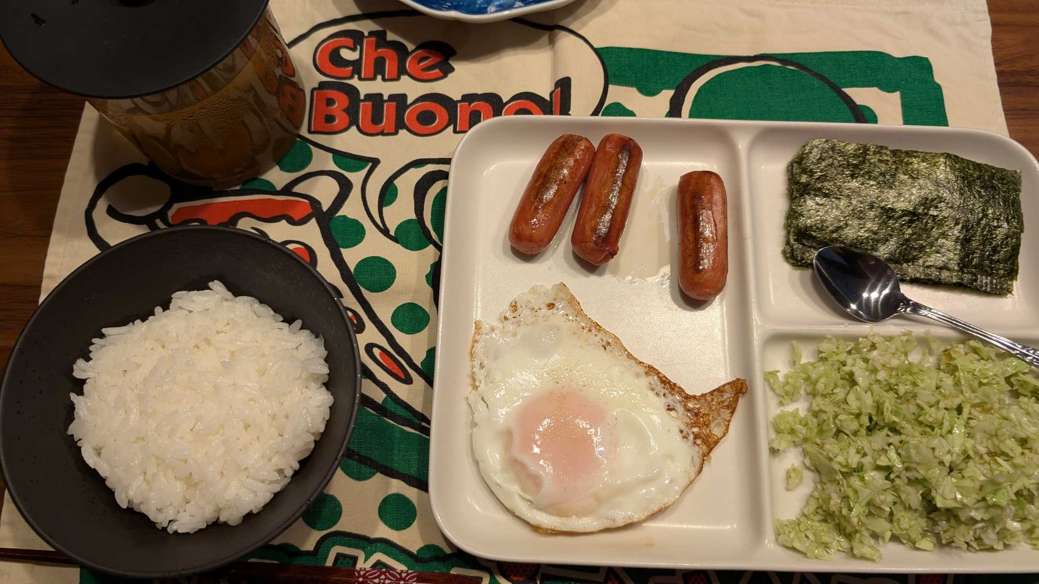 昼食→サラダ、ウィンナー3本、目玉焼き、焼きのり、ご飯、ハト麦茶