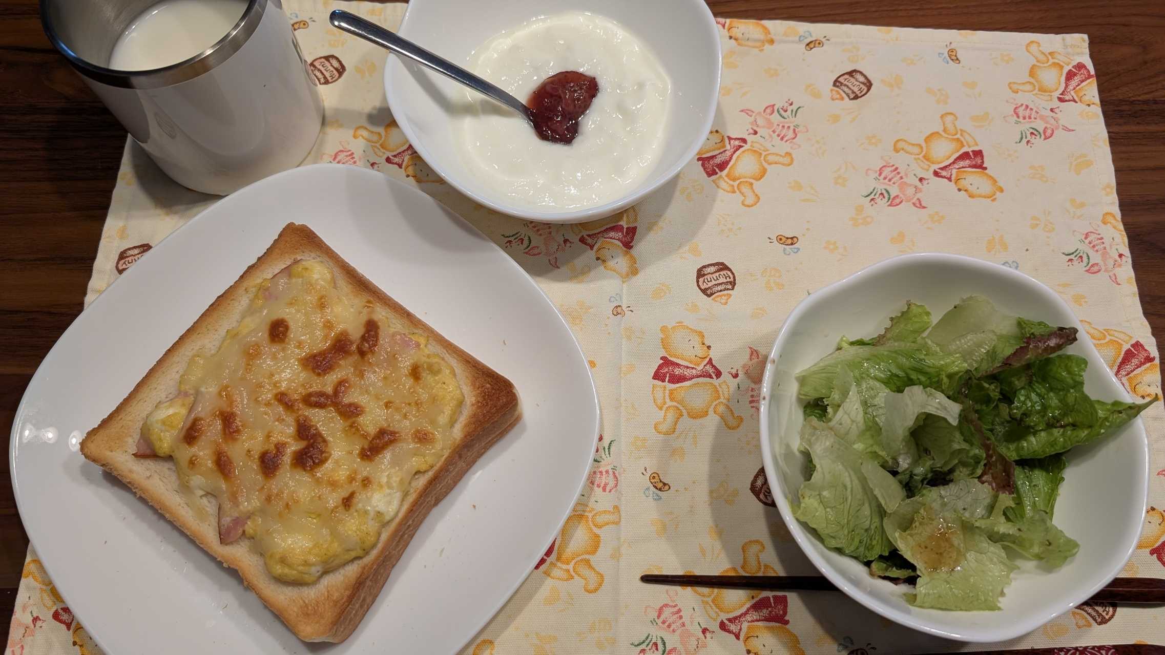 昼食→サラダ、イチゴジャムヨーグルト、スクランブルエッグトースト、牛乳