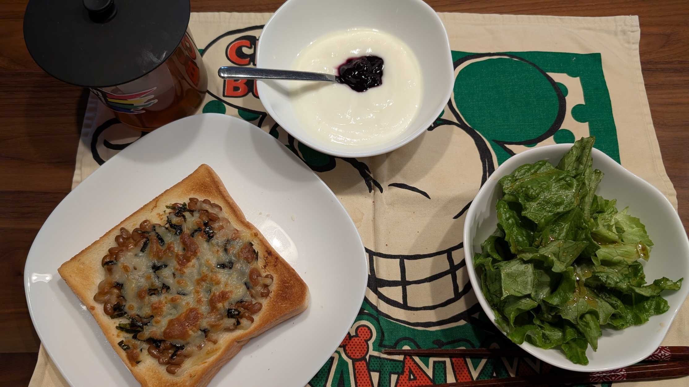 昼食→サラダ、ブルーベリージャムヨーグルト、納豆トースト、ルイボスティー