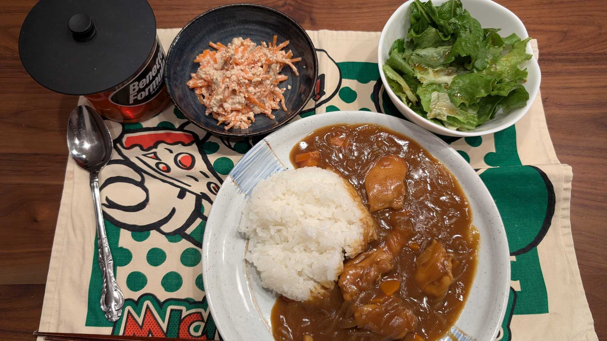 夕食→サラダ、人参の白和え、チキンカレーライス、ルイボスティー