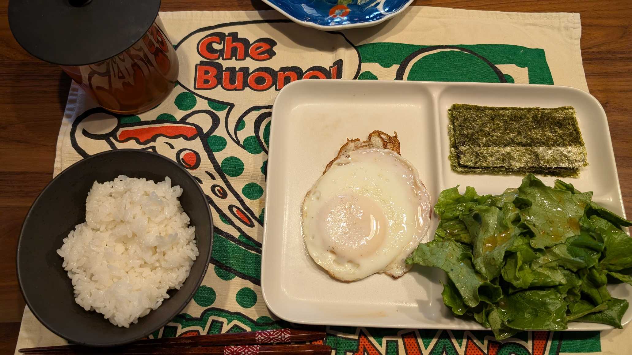 朝食→サラダ、ハムエッグ、焼きのり、ご飯、ルイボスティー