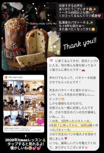~ ほっこりCafé風❤ パンとお料理の教室 Little Magic ~パン教室の詳しいご案内はこちら→★ ご新規の方は必ずご一読ください♪生徒さんのお声&つくレポです♪→★私のcottaコラム一覧はこちら♪→★いつも『手こねパン教室 Little Magic』にお越し下さりありがとうございます☆彡4月の日程とメニューが決まりましたのでお知らせします♪ご予約スタート直後はメールが混み合いますので、お返事まで2~3時間ほどいただきますが宜しくお願い致します♪<(_ _*)>ご希望日を第三希望くらいまでお知らせくださると、お席をお取りしやすくなります❤*********************★キャンセル規約★●7日前より…1000円●前日…半額●当日…全額(全額の場合、レシピをお渡しします) ******************** パン焼きWishNote♬「ハムロール」4個 レッスン料6000円「ツナマヨパン」5個 レッスン料6000円(レッスン代・レシピ代・材料費・フォトスペース撮影・ドリンク代含む)パン焼きWishNote♬とはパン焼きビギナーさんのための基礎クラスです♪おうちでも作りやすく♪毎日の食卓で大活躍する人気のパンをご紹介していきます♡※パン作り初めての方は「ハムロール」からがオススメです♡※日程はご相談のうえ決定しましょう♪まずはお問い合わせください♡Littleコース「明太ソフトフランス」3個 レッスン料6000円(レッスン代・レシピ代・材料費・フォトスペース撮影・ドリンク代含む)同料金にてレシピ販売も可です♪パン焼き中級者~対象硬すぎないどなたでも食べやすいソフトフランス生地で明太フランスを焼きます♬スチーム焼成の方法、クープが開くコツなどを学びます♪Magicコース「塩こうじミルク」1台 レッスン料6500円(レッスン代・レシピ代・材料費・フォトスペース撮影・ドリンク代含む)6000円にてレシピ販売も可です♪パン焼き中級者~対象パン生地にも、ミルククリームにも、塩こうじを使う新しいスイーツパン♡材料はすべてスーパーで手に入るので、とっても作りやすい可愛いパンです♪翌日も余裕のしっとりふわふわなのでプレゼントにもピッタリです!★各日、駐車場を先着2台ご用意できます★(駐車場ご希望の方は、4ケタの車番をご予約時にお伝えくださいませ♪)★定員4~5名2席以上にて開講決定★★全日程お子様連れ不可★キャンセル待ちも受け付けています♪お席が空き次第、順次ご案内させて頂きます♪19日(日)10時~14時ころ 満席Thanks♪♪♪♪ 皆様のご予約をお待ちしております ♪♪♪❤色んな地域からお通いいただいています❤愛知県・岐阜県・三重県・静岡県・富山県・大阪府兵庫県・和歌山県・神奈川県・東京都・茨城県・沖縄県いつもありがとうございます☆(*´ω`*)愛知県名古屋市港区パン教室・料理教室 Little Magic講師 三宅さおりご予約・お問い合わせ↓little_magic_studio@yahoo.co.jp三宅さおりのインスタグラムはこちら♪( ´艸`)→❤❤❤いいね!フォローいただけると~とっても嬉しいです♪にほんブログ村人気ブログラン