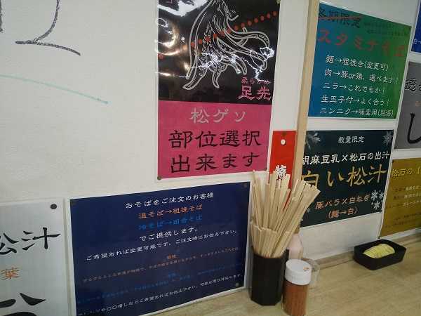 当初は、オーセンティックな立ち食いそば屋っぽいところから始めたが、徐々に独自色を出して『スタミナそば』・『塩そば』・『豆乳そば』などの新メニューを開発して提供。それらも絶大な支持を得ている注目店