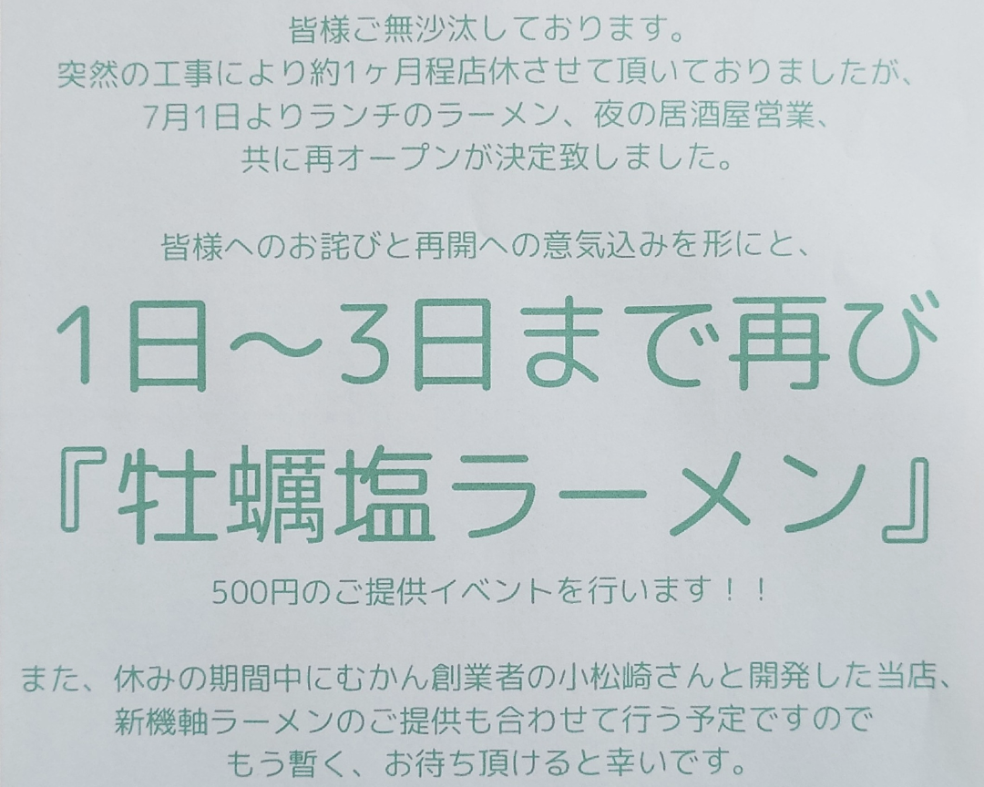 🦪牡蠣むかん 錦糸町店 ㊗️7/1 リニューアルオープン(営業再開)🏵️ 店頭〜店入口〜店内、前とあまり変わらない どこを工事をしたのか、わからないのですが、 🎉リニューアルおめでとうございます😋 店内のテーブル席の手前に椅子🪑が設置され 店内待ちが6人分有、後続は店外(階段→店外) 15人待ちで着丼まで50分だと思ってたけど、 店内待ち(最大いたと仮定して)含めると、 21人待ちで着丼まで50分という事だったか🤔 🦪牡蠣塩ラーメン+肉丼+味玉 ![]() ↑ 🦪牡蠣塩ラーメン+肉丼+味玉 牡蠣の旨味、甘味、塩味を感じるスープ オリーブオイルで、少しオイリーさも ガーリックの香ばしさも感じるスープに、 三河屋製麺の細ストレート麺が絡んで美味い😋 牡蠣のアヒージョで旨味がさらにUP📈💥 ![]() ↑ 肉丼 私は全く予約がとれなかったので中野坂上は未訪😅 なので、初台店(KitchenGATE)の味に似てる😋 薄豚ロースに甘ダレにマヨネーズ絡め食べ美味い😋 ![]() ↑ 味玉は後半がオススメ。 牡蠣のアヒージョで旨味を増したスープに沁みて美味い🥚 ![]() ↑ 激辛し高菜、黒七味、ぶどう山椒、りんご酢にんにく、かえし かえしはラーメンのかえし ぶどう山椒は初台にもありましたね😋 ![]() ↑ 7/1〜7/3 牡蠣塩ラーメン 800円→500円 ![]() ↑ 店頭ポスター 3日間 500円 最後まで読んでいただき、 ありがとうございました。 #牡蠣むかん錦糸町店 #牡蠣むかん #むかん #錦糸町店 #牡蠣塩ラーメン #牡蠣のアヒージョ #オリーブオイル #開店 #新店 #オープン #リニューアル #錦糸町 #江東橋 #京葉道路 #中之橋通り #ベクターブルーイング #ベクターブルーイング取扱店 お気に入りの記事を「いいね!」で応援しよう