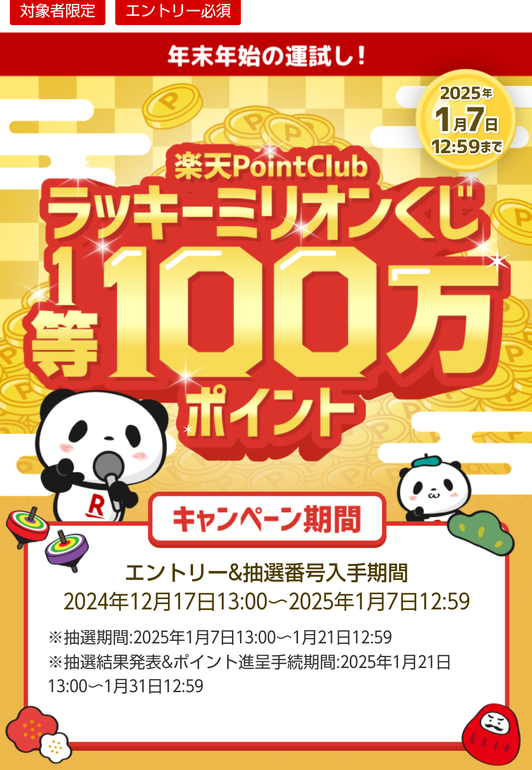 3人に1人が当たる!毎日の運試し♪ 7,777名が当たるラッキーくじ次回【トレジャーハントドリームくじ】9/27 10時~8/23開催分【楽天市場】お買い物マラソン│ポイント当たる!マラソンスロット【楽天市場】勝ったら倍ポイントキャンペーン!楽天イーグルス・ヴィッセル神戸をみんなで応援しよう楽天ヘルスケア毎日歩こうミッション/楽天シニアクリックするだけでポイント獲得!|楽天シニア最大5ポイントGET!秋の味覚を収穫しよう! | キャンペーン | LINE ポイントクラブ 11時~LINEチラシ | 得々マラソン~9/25サリーの冒険クエスト~9/30楽天ポイントモール | ドリームくじ 月曜結果発表くるくる回る三角くじをキャッチ!わくわくクーポンくじ月曜12時更新Rakuten Pasha - 今日のレシートキャンペーン | RakutenRakuten Pasha - Pasha抽選会 | Rakuten楽天トラベル ラッキーくじ【Super Point Screen】毎日開催!ラッキーくじ~11/30マネ活ラッキーくじ~10/31【おすすめチラシ】毎日当たる!ラッキーくじ~12/31楽天PointClubアプリラッキーくじ ポイントモールアプリを開くサービス体験隊【Rチャンネル】 | 楽天超ミニバイトミッション一覧|Infoseek] ミッション→週3回アクセス楽天ぐるなびアプリを開く 週3回起動するたのしいポイ活アプリ「ポモチ」【シェアで~はAndroid】【初めてのアプリ予約限定】最大20,000ポイント当たる! | 楽天ビューティ楽天ブラウザ|ポイントミッションのご利用方法楽天PointClubアプリ楽天ウェブ検索アプリトウシルアプリポイントモール内?クリック1pバーナー私の場合はBINGOのあとの画面で出ましたけど?楽天ブラウザ ホームページクリック楽天ブックス:楽天ブックス 注目情報!現金プレゼント | 楽天銀行 口座保有者限定楽天ウェブ検索アプリ お知らせ&お得情報クリック楽天 ウェブ検索トップページクリック超ミニバイト メッセージクリック 月曜・金曜11時更新【楽天市場】ママ割|ママ割メンバー限定アンケート?新規利用キャンペーン|楽天家計簿?【楽天市場】iRobot あなたに合う最新ルンバはどちら?楽天ウェブ検索|お買い物検索ポイント抽選キャンペーン!楽天ポイントカード 1日1回毎日挑戦!ジャンケンチャレンジ 【楽天PointClub】最大10万ポイント当たる「貯めトク!ガチャ」貯めトクモードON+500p~楽天シニア|250万DL達成記念 抽選で1,000名の方に250倍のポイント進呈キャンペーン!【パ・リーグSpecial】楽天会員ならどなたでも ほぼ毎週開催! 予想クイズに正解して、ポイントをゲットしよう! | 楽天TV抽選で楽天イーグルスグッズやポイントが当たる!|楽天ブラウザ×楽天イーグルス楽天ブックス:楽天ブックスのクイズに答えてエントリーした方の中から抽選で5名様に3,000ポイント当たる!楽天ビューティのXフォロー&リポストで5,000ポイント抽選キャンペーン | 楽天ビューティ「14×17」「78×73」「105×105」をどれも爆速で暗算できる“すごい”方法