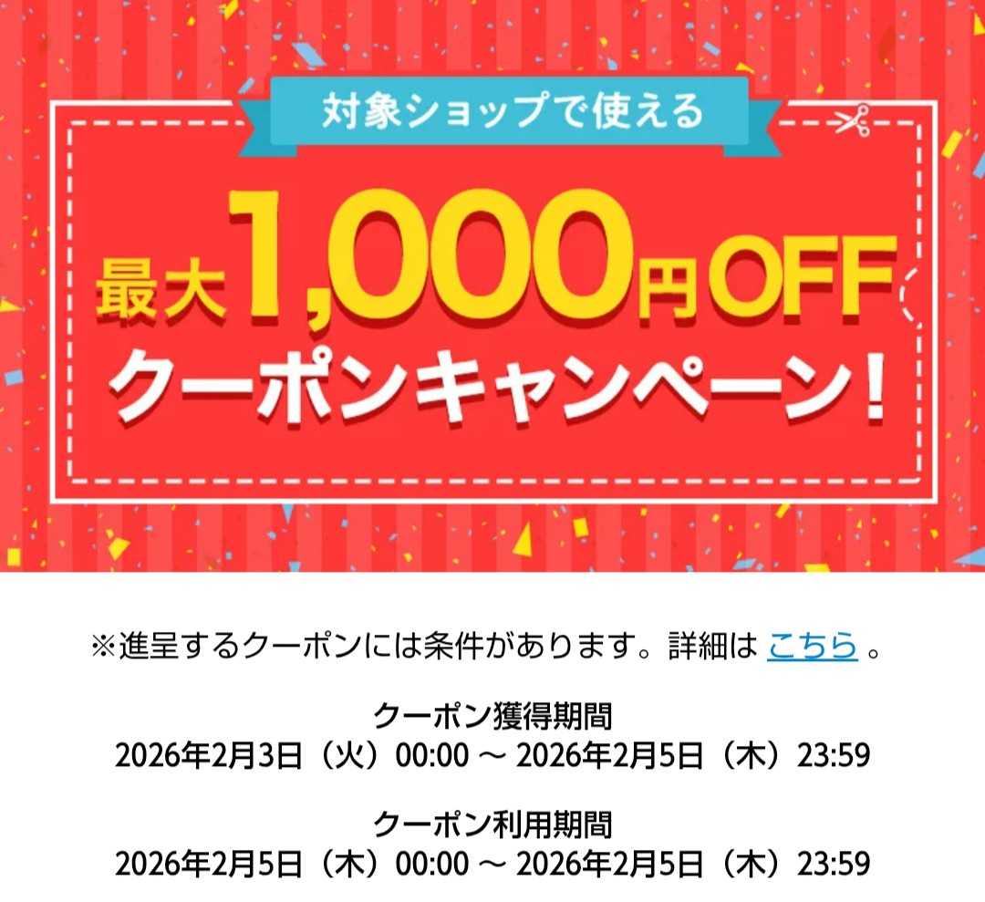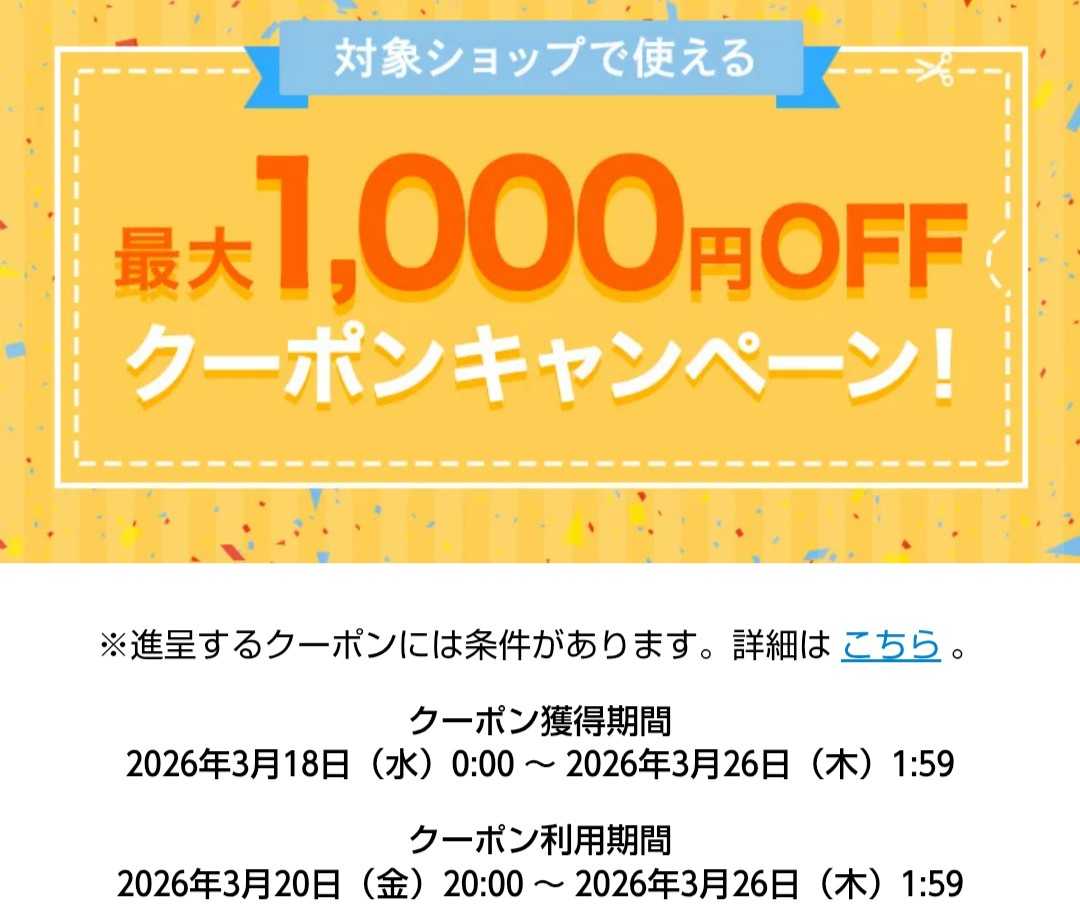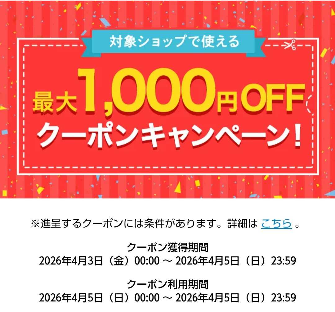 対象ショップで使える最大1,000円OFFクーポンキャンペーン!⬇4/3 15時以降から