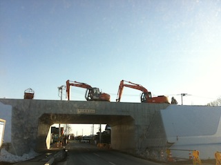 俯いてちょっとお休み日曜日の静かなユンボ兄弟大きな橋の工事中いつもはフル稼働です