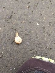 手前の靴の大きさに比べてかたつむりさんの大きさが分かりますか草むらから道に迷って歩道に出てきてしまったみたいですねちゃんとお家にお帰り〜