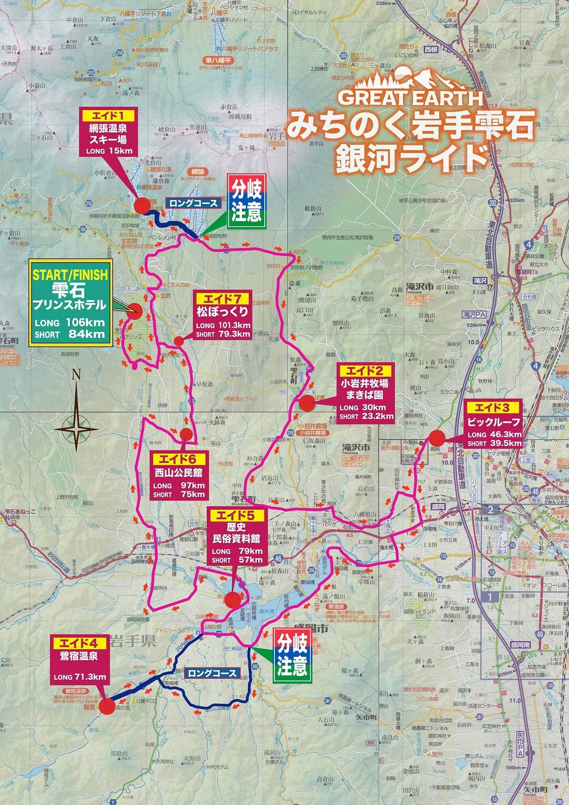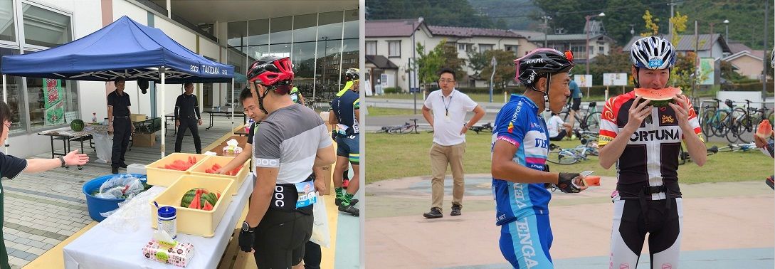 あべっちです! 9/8(日)夏から秋へと景色が変わりゆく岩手に、 全国から自転車が大好きなみなさんが集まりましたよ! 「第7回GREAT EARTH みちのく岩手雫石銀河ライド」が行われました。 ![]() 大会の詳細はこちら⇒GREAT EARTH みちのく岩手雫石銀河ライド ![]() 薄曇りの中スタートとゴールの会場となった、雫石プリンスホテルの ![]() 参加コースは2種類、全長106kmのロングコース(募集定員400名)と ![]() この大会を盛り上げるナビゲータは 左上の写真白戸太朗さん (トライアスロン選手、スポーツキャスターとしても活躍) 右上の写真片岡由衣さん (バラエティ番組やスポーツ番組に出演、MCやナレーションなど幅広く活躍) ![]() 猿子雫石町長が大会のご挨拶を行いました。 ![]() スタート前のラジオ体操はグレートアースの恒例だそうですが なぜか津軽弁のラジオ体操でした。 ![]() 午前7時いよいよ、ロングコースにエントリーのみなさんからスタート、 幾つかのグループに分けて順にスタートします。 順位は関係なく、安全に完走することが最大の目標なので、 みなさん笑顔でゆるくスタートしていきます。 ![]() ショートコース参加のみなさんは、 午前8時のスタートまで、順番をまちます。 ![]() スタート直後は、少し長い下り坂になっていますが、 ゴールに戻ってくる時は、最後の難関になりますね。 ![]() ロングコースにエントリーのみんさんは、長い登坂を走り切り、 網張温泉についてはこちら⇒休暇村岩手網張温泉 ![]() ここでは、雫石町の洋菓子店中村屋さんのマカロンと みずみずしくて甘いぶどうがお振舞されました。 ![]() 次のエイド2は、小岩井農場まき場園です。 網張温泉スキー場から約18km先のほぼ下り坂 到着したみなさんはサイクルスタンドに自転車を止め、まき場園のエイドステーションの牛丼お振舞を目指します。 小岩井農場まき場園についてはこちら⇒小岩井農場まき場園 ![]() 次のエイド3は、雫石町を飛び出し、滝沢市役所の向かい側、 ![]() ここでは名物滝沢スイカがお振舞されました。 水分とミネラル補給が出来て最高でしたね。 ![]() 次のエイド4の鶯宿温泉(おうしゅくおんせん)を目指します。 国道46号に出て、雫石川に架かる滝田橋を渡り一旦盛岡市に入ります。 御所湖南側の湖岸を西に走り、繋ぎ温泉(つなぎおんせん)を通過、 ビッグルーフ滝沢から約24kmで、鶯宿温泉うぐいすの湯の里公園に到着。 ![]() こちらのエイドステーションでは、地元鶯宿温泉の 餅工房むらかみさんの黒きりせんしょがお振舞されていました。 ここうぐいすの湯の里公園には、足湯があり みなさん疲れた足をゆっくり癒していましたよ。 ![]() 次はエイド5の雫石町歴史民俗資料館、鶯宿温泉から約7.5kmです。 ![]() こちらでは、雫石牛の入ったジャンボソーセージが振舞われていました。 ![]() 次はエイド6の西山公民館に到着、雫石町歴史民俗資料館から約17.5km。 なんと!先に到着した人が餅つきをしているではありませんか!![]() こちらのエイドステーションでは、手づくりのお餅や ![]() 次はエイド7の松ぼっくりさんです。西山公民館から約4.5km、 手づくりアイスクリームが大人気のお店ですよ! 詳しくはこちら⇒手づくりアイスクリーム牧舎松ぼっくり ![]() 食べ終わった人から順に、満足した笑顔でゴールを目指します。 ![]() ゴールの雫石プリンスホテルの駐車場までには、エイド7の松ぼっくりさんから ![]() お互い声をかけ励ましあいながら、ゴールを目指します。 ![]() おめでとうございます。無事ゴールしました。 ![]() 早い方々は午後1時30分頃、既にゴールしていました。 ロングコース106km、ショートコース84km良い天気にも恵まれ、 みなさん良い汗をかきましたね!次回も是非参加してくださいね。 ![]() この大会の様子は、シクロワイアードさんの サイトでもご覧いただけます。 ![]() 詳しくはこちら⇓ GREAT EARTHみちのく岩手雫石銀河ライド2019 レポート前編新幹線こまちとローカル線を乗り継いで雫石へ わんこそばを食べてグレートアースを走る |