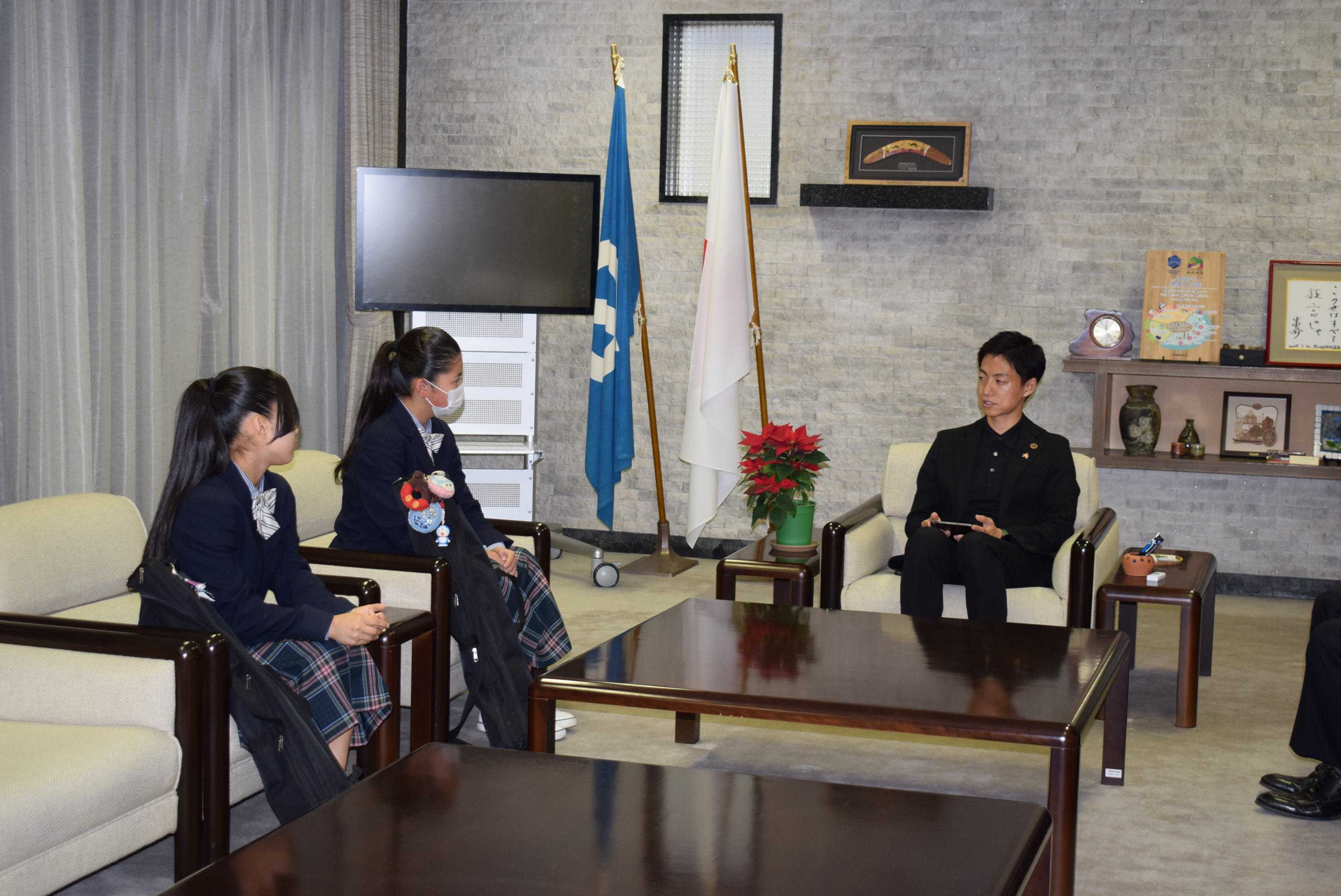 「関市立関商工高等学校バトントワリング部」の2年生の尾関咲葉さんと1年生の磯野未莉弥さんが、東海大会で金賞を受賞し、全国大会に出場することを報告するために、美濃加茂市長を表敬訪問されました。