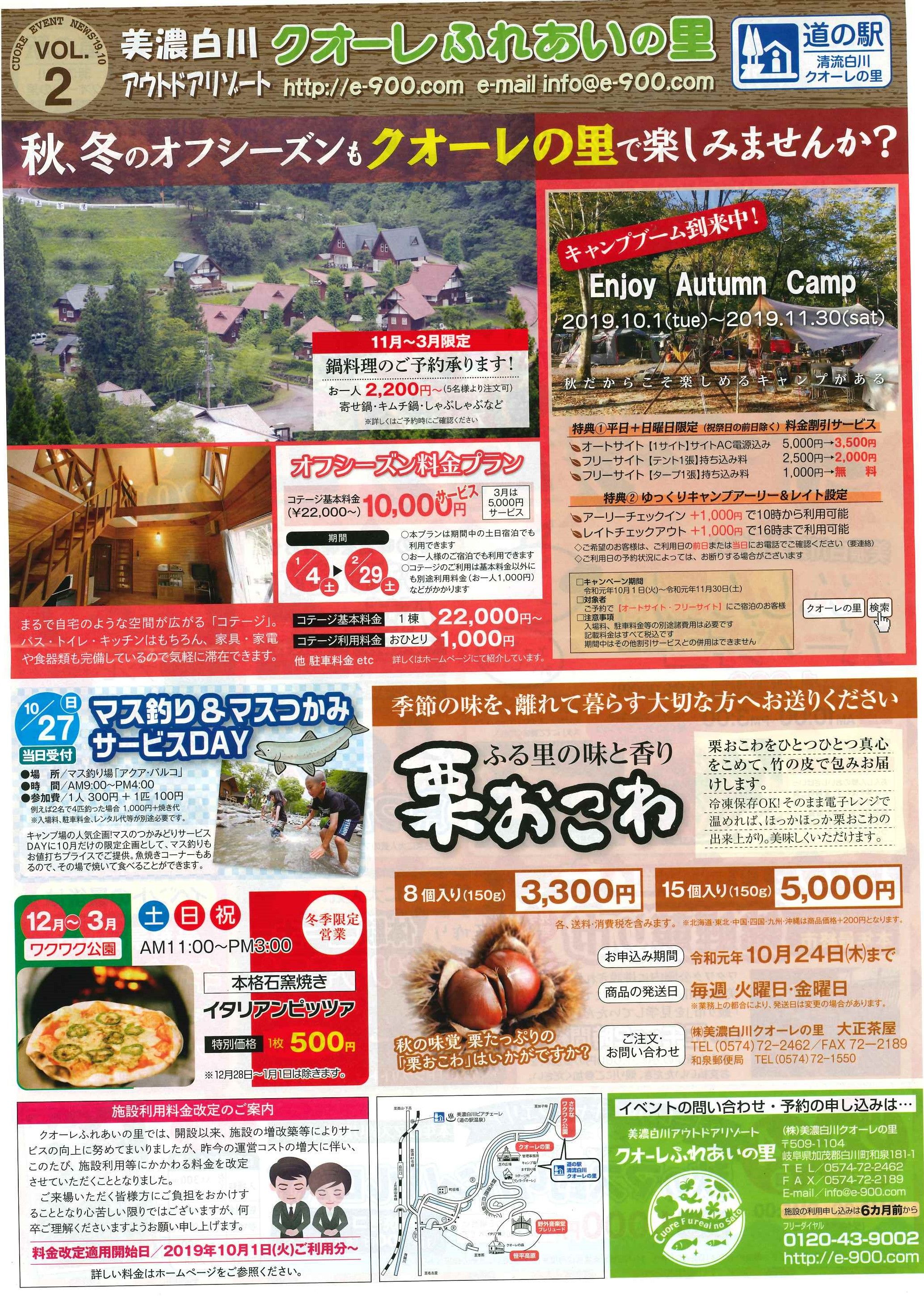 さかなワクワク公園 秋の大感謝祭 ~オータムフェスタ2019~ 開催日 10月20日(日) 午前10時から 遊ぶ。食べる。見る。 一日満喫できますよ。 【遊ぶ】 マス釣りやマスつかみ体験、どんぐりクラフトなど、お子様に人気の体験企画。 【食べる】 イベントだけのサービス価格『あんしん豚バーベキュー』がおひとり様1,000円。 バーベキューの他に『うまいもんバザー』栗ご飯にへぼご飯。鮎の塩焼きやキノコ汁も。 本格石釜で焼いたイタリアンピッツアも特別価格で販売します。 【見る】 ワクワク公園内に併設されている美濃白川錦鯉センターでは、今年最後の錦鯉競り市が開催されます。 迫力満点、競り市を是非ご覧ください。 イベントの最後は、キャンディーまきで豪華景品をゲットしよう!! オフシーズンは、お値打ちにクオーレふれあいの里で!!