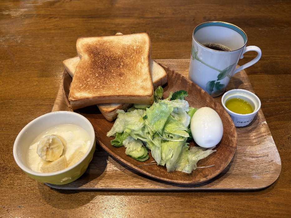 食パンにオリーブオイルをたっぷりと塗っていただきましたゆで卵にチーズ、レタス、バナナの朝ごはんでした とっても美味しかったです今日も元気にスタートしました