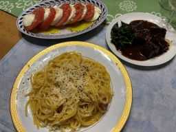 木曜日はKanaちゃん先生のヨガの練習です♪ ヨガ前体重 98.25Kg ヨガ後体重 97.95Kg 此処の所、97Kg台をしばしば計測するようになりまして、親父は上機嫌でございます(=本当はもっと切り下げていかなくてはいけない ^^) ![]() と調子に乗ってお昼は大久保で途中下車して何時ものEKG、即ちEverest Khaj Gharにお昼を頂きに参ります♪ 今日はダルバートに内臓の炒め物である「ブタン」をプラスすると言う変化をつけてのランチタイムでありまして、何時もの干し羊肉の炒め物の「スクティ」に味の点では好みが上なんですが、色々食べてみるのも(メニューの少ないお店ですが ^^)楽しい事でありました♪ ![]() と言う夜は食当♪ Youtube番組の「ボナぺTV」さんが監修して、フィレンツェのレストランシェフTOSHIさんのお料理をレシポ本にまとめた「イタリア人気食堂レシピ」からのご提供 ( ̄ー ̄)ニヤリ 1)Antipasto:Caprese 2)Primo :Carbonara 3)Secondo :Peposo SMにバジルが売っておらず、イタリア国旗カラーに仕上がらなかったのは残念なn事でありましたが、政党料理法に諸説あるカルボナーラも美味しく出来まして、パスタだけなら何時でも来い!と言う気分でございます ( ̄▽ ̄) 牛肉を胡椒たっぷりで煮込んだ「ペポーゾ」も鍋一つで出来上がっちゃう有難いお料理でありまして、塊肉を手配してまた作っちゃおうと目論んでおりまする♪ 偶にはインド料理以外も良いものですね ( ̄ー ̄)ニヤリ 今日も美味しく出来ました♪ ![]() と言う今日のお供のワインはキャンティの「BRANCAIA」でございます。 Enoteca Aliceの試飲会に出ていたので買ったものですが、ワインを飲み始めた頃は、シンプルな洒落たエチケットのこのワインは丁度出始めだったように記憶しておりまして、矢立代表に「懐かしい感じのするワインですよね」と言うと、「そうなんですよね、最近は余り見かけなくなりました」と話が通じて嬉しかったワインでございます♪ しっかりした味わいの美味しいワイン! 親父の手料理とピタピタでありました ( ̄ー ̄)ニヤリ