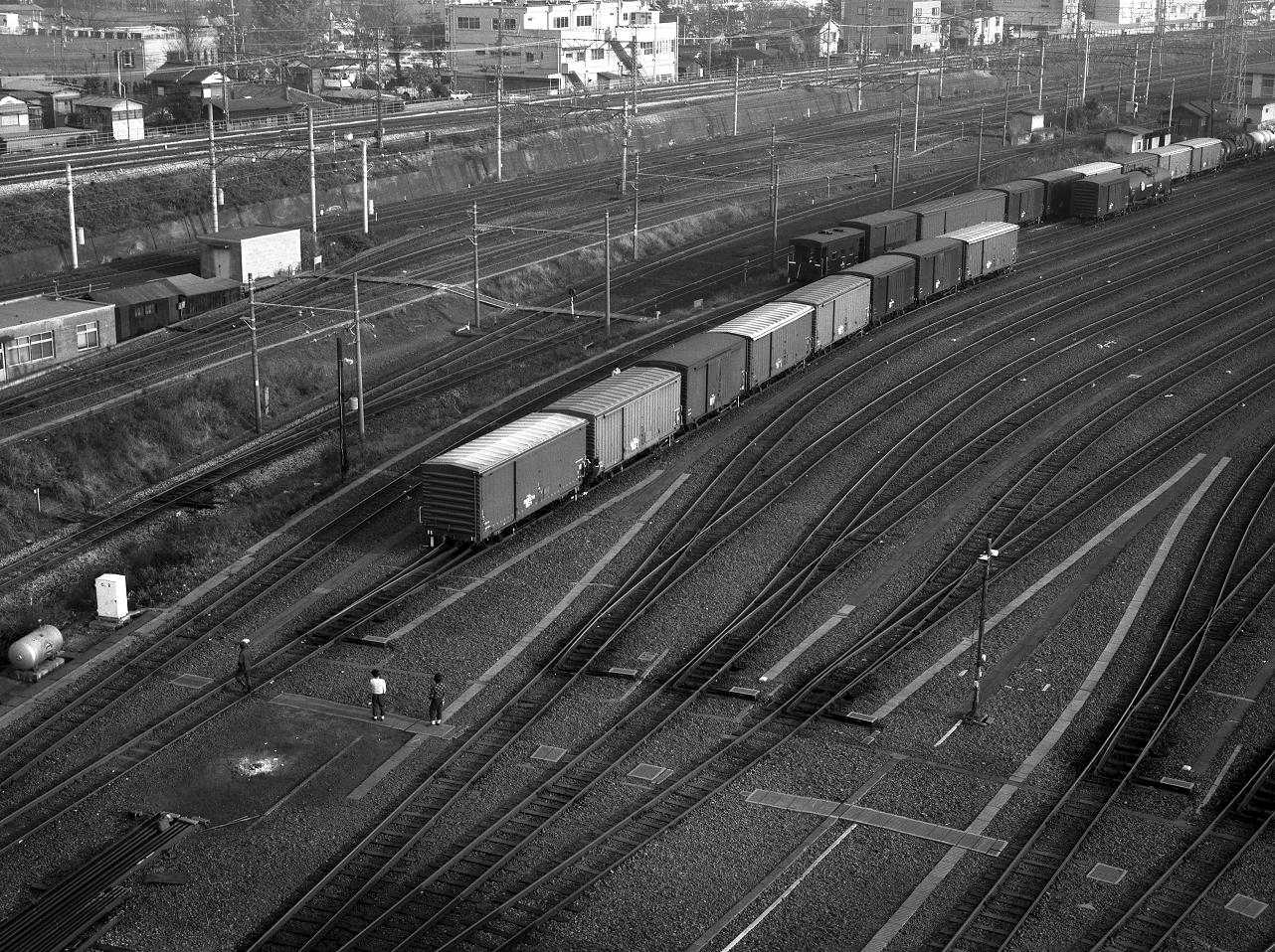 大宮操車場 ハンプ入換(連結・ヤード編)大宮操車場 ハンプ入換(散転・カーリターダー編)に続き、入換が始まります。カーリターダーで速度制御を受けた貨車は、各群線に早歩きするくらいの速度でやってきます。これを下で待っている各番線担当の連結手(構内係)が貨車に飛び乗り、目標地点まで運びます。貨車には全車に添乗ブレーキ(手ブレーキ)が付いています。これは、貨車は全ての車両がバラバラに組成・留置される可能性があるため、客車のように編成単位で緩急車を連結しておけば良いという発想がないためです。また、ハンプ入換や突放入換なども昔から行われており、各車両に添乗ブレーキがないと入換えそのものに支障があるわけですね。貨車の手ブレーキは、大きく分けて3種類あります。1つ目は、貨車の側面に付いている側ブレーキと呼ばれるものです。この白い手すりに掴まって添乗し、車体中央方向から伸びる足踏み敷きのテコを踏みつけてブレーキを掛けます。踏みつけると言っても、実際には飛び跳ねてから全体重を掛けて下に踏み込むと言う感じです。側ブレーキは、有蓋車(いわゆる箱型の貨車)、無蓋車(屋根のないアオリ戸のある貨車)、タンク車の一部などに主に使われています。長物車にも使用されますが、台枠より上に車体が無いため、仰け反る様なやや特殊な格好で添乗する設備になっています。(この車両は、長時間掴まるのが一番ツライ体勢になるので好きではない。)2つ目は、車上に昇って添乗するいわゆるハンドルブレーキタイプのもので、ステップから貨車の上に昇り、平らな部分に乗ってハンドルをグルグルと回し緊締するものです。ハンドルブレーキは、車掌車やコンテナ車、各種ホッパー車、タンク車の多勢に使用されており、長時間添乗するには楽ができるタイプです。ただし、ハンドルの巻き取りに時間が掛かるため、体重で制御する側ブレーキに比べると急ブレーキを掛けるのが難しいと言えます。3つ目は、床下にあるハンドルを回すタイプのものがあります。添乗設備が無いため、突放やハンプ入換は禁止となり、『突放禁止』の表記が書かれています。ク5000や最近ではコンテナ車の100系タイプがこれに該当しています。ただし、他の添乗ブレーキが付いている車両と一体で入換える場合には、別の貨車でブレーキ制御が出来るため、突放やハンプ入換をすることもあります。連結作業は、単純に群線に停止している貨車に次々と連結していく手段もありますが、群線によっては500mもの長さを有する番線もあり、また、場合によっては1つおきに次々と自分の番線に落ちてくることもありますから、簡単に1つずつ連結している場合ではないこともあります。そのような場合は、一番上の写真のように貨車の最後部に添乗し、ある程度の中間地点で貨車を停め、後から来た貨車をぶつけてから最後の地点に持っていく、というような方法が一般的です。これを1度の作業で7・8回も繰り返しながら、などというのも稀ではありません。次に来る貨車に乗ってブレーキを掛けるため、停める貨車と次に来る貨車を往復しながら走るわけですから、運が悪いと相当な距離を走らされることになります。物足りない材料ですが、ハンプ入換の一連の作業をご紹介させていただきましたので、次回からは構内の情景をご紹介して参ろうと思います。先日、家の片付けをしていたら自分の写真が出てきました。二十歳くらい。身長180cmで体重は60kgくらい。今とは比較できないくらい痩せてました。運動量と精神的なストレスで、いくら食べても太ることはありませんでした。つづく