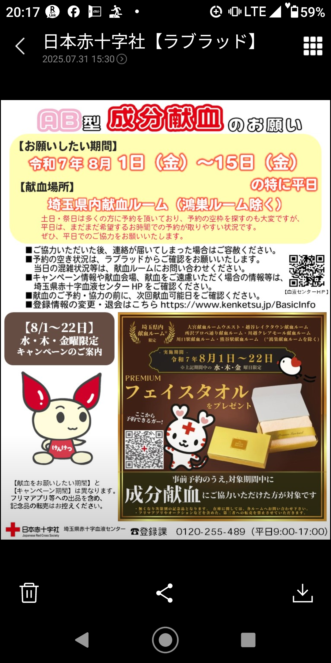 【献血日:2024年(令和6年)8月17日(土)】 ※ 献血(127回目) 〈越谷レイクタウン献血ルーム(埼玉県越谷市レイクタウン3-1-1)〉