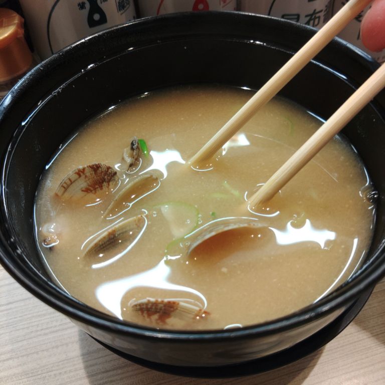 【食べた日:2025年(令和7年)5月13日(火)】 あおさのみそ汁を注文したら、あさりが来た。 みそ汁100円引きクーポン使用 ※ あさりみそ汁(32円←132円←242円)