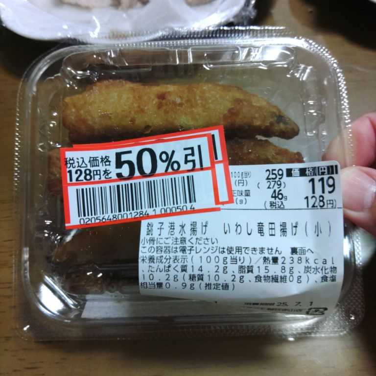 【食べた日:2025年(令和7年)7月1日(火)】 ※ 銚子港水揚げ いわし竜田揚げ(小)(64円←128円) 〈ヨークマート 越谷赤山店(埼玉県越谷市赤山町5-8-39)〉