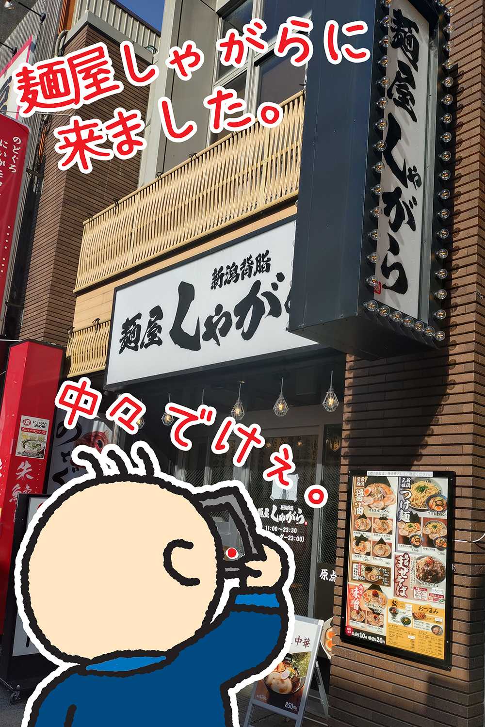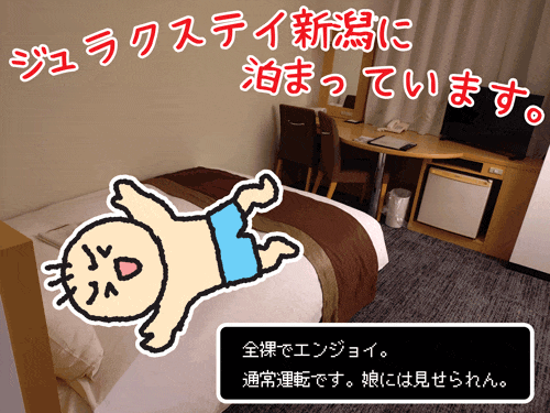 どうも。 同じところをウロチョロ徘徊している者です。 いいんだよ。同じラーメン屋さんに行っても。だって好きなお店に行きたいんだもの。 いいんだよ。100円ショップハシゴしても。楽しいじゃん。 だからいいのさ・・・同じところに出張行っても。 新潟に出張に行きます。 そろそろ定期でも買った方がいいんじゃないかと思われる頻度。 ちょっと前まで新幹線通勤してた同僚がチラホラいましたが令和の今はどうなんだろう。 新幹線はあまり好きじゃない。 だって帰りの新幹線で缶ビールとか空けてる人いるじゃん? 乗り物でお酒は飲まないポリシーを持ってる初老です。 新幹線ならまだ許す。 常磐線下りで晩酌してる奴!!お前だ!お前! 通勤電車だぞ。お家まで待てないのか? イカ臭いんだよ。 ともあれ新潟に移動します。 3連休の初日です。 上野駅激込み。 立ち食い蕎麦も外人マシマシで入れませんでした。 許すまじ。インバウンド。(でも前より外人のマナーが良くなった気がする。) まさかの指定席取れず。 おいおい。立って新潟まで行けというのか。 中々の拷問。 向かいのフィリピン人がゼロ距離でビール飲み始めた。 くそう。 おまえら観光かもしれんがこちとら仕事なんです。 もうふてくされて外の景色を対面フィリピン人のゲップの香りと一緒に楽しみます。(2時間強) ようやく新潟に着きました。 ストレスゲージがMAXで真空波動拳が撃てそうです。 落ち着かせるべくラーメン食べます。 麺屋しゃがらに来ました。 もう慣れたもんです。 (ほんとはまごころ亭に行きたかったけど移転して妥協したのは内緒だ。) お昼です。 味玉醤油(並)を頼みました。 これからお仕事なのでライスはつけない。 血糖値上昇お昼寝しちゃうからな。 節制ができる初老です。 味玉醤油ラーメンが来ました。 ブラボーです。 おいしそうです。 やるじゃないか新潟。 嬉しくて久々にレルヒさん(新潟のゆるキャラ)描いちゃう。 おスープ飲みます。 まあまあの背脂。 この背脂が全て私のお腹にフュージョンします。 恐るべし。 後悔はしていない。(今は) 麺を食べるぜ。 知ってる。 うまい。 新潟はもっとラーメン文化を全面に出していいと思う。 うまい。 味玉&お肉を食べます。 どっちもうまい。 朝食(立ち食い蕎麦)食ってないからかな? 空腹のバフがかかっていたかもしれん。 でもうまかった。 完飲しちゃった♪ てへぺろ♪ だっておいしかったんだもん♪ 冷静に考えるとこんなコメントしてる初老キモい。 否、くじけちゃいかん。 ブログだもんな。 日記だもんな。 気にしちゃいかん。 ドンマイ。俺。 お仕事終わってホテルに向かうぜ。 ジュラクステイホテルに泊まりました。 綺麗で好きなの。 いつも通り全裸で堪能します。