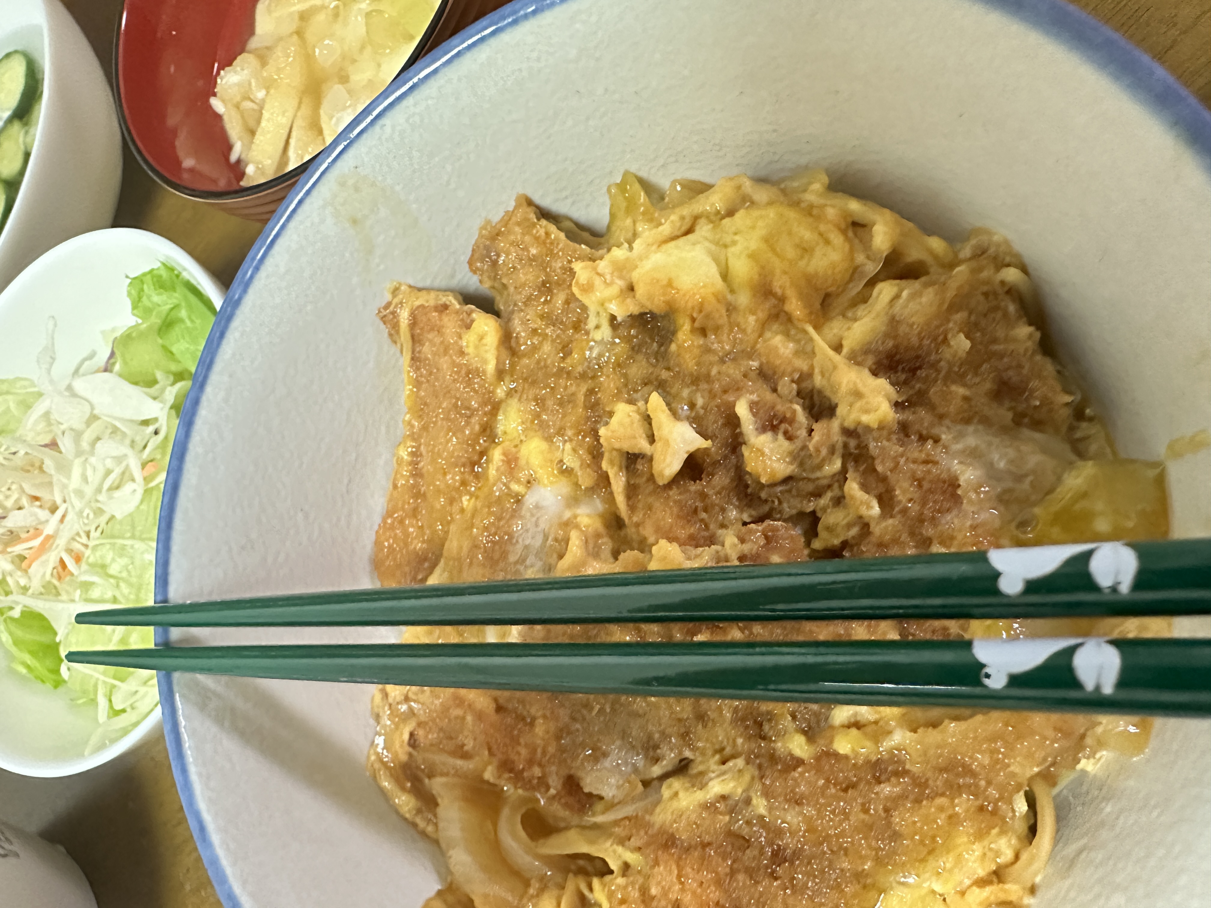 今夜は、昨夜の残り物で、豚カツで、カツ丼❣️どんぶりに目一杯乗っていて、多すぎる‼️🤪お腹いっぱいで満足
