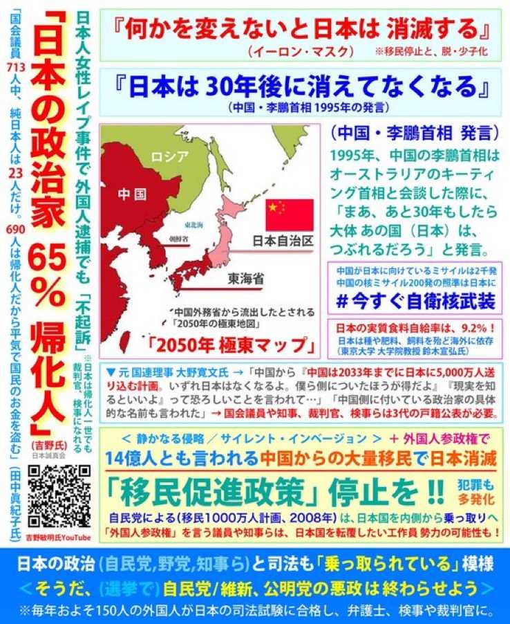 2026年 1月28日(水)….晴れ☀️ 最高気温….9度 最低気温….−3度 残り338日 26ヶ月 77日 10ヶ月 冷蔵庫気温….続々続く 多文化共生😼って 外国人も 生活者ファーストの中道なんとか=全く駄目です👎🙅 野田共同代表が信用ならない人👦 批判する自民党は統一教会とズブズブが デイリーwillで野田さんの過去を バラされてしどろもどろの 大ブーメラン🪃この人も落選した 方が良い嘘つき🤥外国人優遇政治屋 ➕齋藤代表=比例中国ブロック第1位って⁉️ この方=不記載裏金1億の男です 自民党は裏金野党は不記載って 言うオールドメディアの異常 どっちも裏金だろよ💢 公明党票欲しさに理念も捨てて 選挙🗳️だけ=衆議院議員だけくっついた 相変わらずの看板🪧のすり替え政党をぶっ潰そう‼️…. 『外国人参政権に何時も賛成している= 日本を破壊する政党がこの中道なんとかです』💢 2月8日日曜日の投開票が楽しみです この中道なんとかが=現有議席の半分以下になることを望みます🤲 『落選多数で看板崩壊=中道=🇨🇳への道🛣️』です ![]() 🇨🇳外交部日本🇯🇵への春節での渡航自粛要請 『良かった❗️よかった❗️』 静かな観光地が戻るでしょう⭕️ マナー無い輩が来なくて良いわ🙆 李鵬首相が🇨🇳日本が消えてなくなる と言って丁度30年 この重要な選挙🗳️ 未来の🇯🇵を問う選挙🗳️です 是非組織票を打ち負かす 若い人々👥👥👥の投票率UPで 🇯🇵日本を中から破壊を💥目指す 中道なんとかが カルト創価票👥を凌ぎ 与党が勝って欲しいとういうか 売国議員が続々と落選して欲しい⁉️ ![]() ![]() 日本破壊を狙う多文化共生だって🔼❌❌❌ 🇨🇳応援📣党📣🔼 ❤️私が応援📣票を入れたい政党🔽❤️👏👏👏 ![]() ![]() 移民を進める自民党⁉️ 高市早苗政権は応援したいが📣….. 自民党には、 石破茂政権を🐣させた 『居座る無駄』政権で❌まだ許せないです 輩が多い 媚中🇨🇳の岸田石破岩屋村上宮沢森山が居る 自民党には投票🗳️しません‼️ お気に入りの記事を「いいね!」で応援しよう